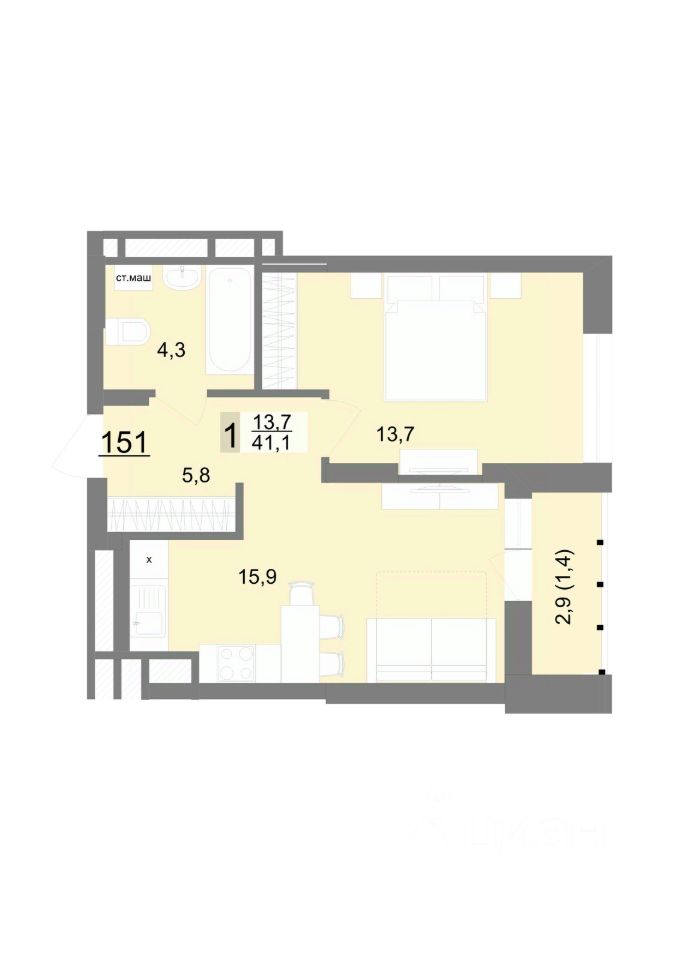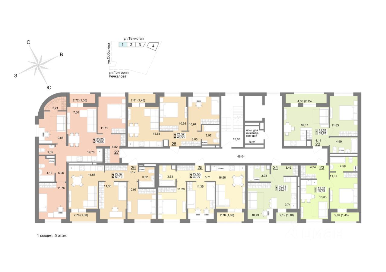 Квартира 55 в подъезде 1. Новое поколение комфорта и технологий для жизни. Закрытый двор без машин. Двухуровневый подземный паркинг с лифтовым спуском и кладовыми. Эргономичные планировки, большие окна, системы фильтрации воды и проветривания. Дизайнерские вестибюли в стилистике советского авангарда и всесезонная игровая комната. Архитектура сочетает лаконичность конструктивизма и современные материалы. В центре квартала запроектирован муниципальный детский сад на 300 мест.
