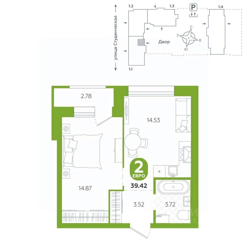 1-к, Студенческая, 1д стр.
