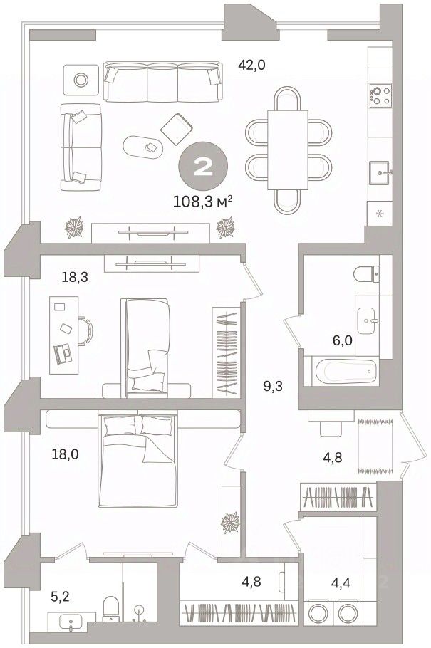 2-комн. квартира от застройщика с предчистовой отделкой в ЖК ''Гоголя 21'' на 11 этаже. Общая площадь: 108.3 кв.м., жилая: 36.3 кв.м., площадь просторной кухни-столовой: 42 кв.м. Угловая квартира, очень светлая, естественная вентиляция при открытии окон. В квартире два совмещенных санузла. Высота потолков 2.98 м. Дом монолитный, двухподъездный, переменной этажности, от 21 до 25 этажей. Квартира находится в 1-й секции высотой 25 этажей в корпусе 1. На этаже 5 квартир. В подъезде 2 пассажирских и 1 грузовой лифт. Начало строительства - 3 квартал 2025 года. Окончание строительства - 3 квартал 2028 года. Оформление сделки по договору долевого участия. Квартира с кухней-гостиной и двумя спальнями в проекте Гоголя 21. Особенности планировки: свободная планировка. квартиры в нашей базе: ЗНГ01-Ж1.11.4. Гоголя 21 станет точкой, привлекающей прогрессивных, состоятельных, предприимчивых, модных, но не пафосных людей. Людей дела. Две башни — олицетворение энергии, того самого, изначального пульса Екатеринбурга, возникшего вместе с ударами молотов первых железоделательных заводов. ''Гоголя 21'' деликатно, но уверенно встраивается в жизнь главной набережной Екатеринбурга. Ведёт уважительный диалог с архитектурными доминантами по соседству. Формирует новый образ городского центра. Две башни — 21 и 25 этажей — объединены четырехэтажной галереей. 169 квартир со свободными планировками, средней площадью в 128 м² и высотой потолков до 3,3 метра напоминают, что на Урале живут люди, привыкшие к простору. Ландшафтные решения в доме на Гоголя, 21 придумали не мы, а Екатеринбург. Главный здесь — гранит. Серый, фактурный, незыблемый, как сам Урал. Он часто встречается на центральных улицах, а в нашем доме используется как материал для мощения и декорирования фонтанов. Все многолетники на клумбах, от гортензии до спиреи, цветут белым: лаконичная палитра привносит в ландшафт уральскую сдержанность и элегантность. На уровне четвёртого этажа устроим главное открытое пространство для отдыха на свежем воздухе — только для жителей ''Гоголя 21''. В центре террасы — большая зона с летней кухней: гриль, барная стойка, общий стол и уютная лаунж-зона, где можно собраться компанией. В событийной зоне поставим беседку и большой стол с азиатским грилем — место для ужинов и летних вечеринок. Пространство примыкает к залу для праздников, поэтому летом здесь можно устраивать большие соседские встречи. Рядом с игровой комнатой появится пространство для детей — в хорошую погоду их можно объединить. Пока дети лепят песочные куличики или придумывают сюжеты в игровом домике, родители смогут приглядывать за ними, раскачиваясь в подвесных креслах с книгой или ноутбуком. А для спокойного отдыха взрослых и разговоров наедине организуем тихую зону у зенитного фонаря. На террасе — спокойная зелень, бело-розовое цветение, медные акценты в сочетании с серым камнем и террасной доской. По периметру — стеклянные ограждения и живая изгородь, которые делают пространство безопасным и по