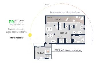 Эксклюзивное предложение, звоните! Продам представительский офис-пентхаус с дизайнерской отделкой в самом сердце Екатеринбурга, по адресу Белинского, 30. С собственной видовой террасой. Общая площадь офиса — 267,9 м2, включает: - 165,1 м2 - open space пространство для работы с переговорной зоной и выделенным кабинетом, - кухню площадью 38,4 м2,- санузел - 4,6 м2,- открытую гранд-террасу 53,9 м2 с пейзажными видами на центр Екатеринбурга. В помещениях большая площадь остекления, приточно-вытяжная вентиляция, кондиционеры.Высота потолков - 2,9-3,2 метра. 9 этаж из 9.Новый владелец офиса формата mix-used сможет использовать его под собственные нужды или сдавать в аренду, спрос на удобные и просторные офисы - огромный.Локация дома говорит сама за себя: сердце Екатеринбурга, в шаговой доступности - Покровский пассаж, универмаг Bolshoy, ТРЦ Гринвич, БЦ Высоцкий, Дендропарк с благоустроенной набережной, парк Павлика Морозова, новая набережная у УГМК-Арены, парк Зеленая Роща, питейные и развлекательные заведения, кафе и огромное количество ресторанов, салонов, фитнес-центров, бассейн в Юности. Недалеко - 3 станции метро.Дом находится под управлением УК, комфортный и чистый подъезд, дружелюбные и спокойные соседи. Наземная парковка.Оформление: продажа по договору купли-продажи, один взрослый собственник, быстрый выход на сделку. Офис без обременений, продается с указанием полной стоимости в договоре.Покупка данного офиса от РR FLАТ недвижимость даёт ряд преимуществ:+ одобрение ипотеки под этот объект - оперативно и бесплатно,+ электронная регистрация сделки в офисе агентства,+ комфортное и внимательное сопровождение сделки,+ РR FLАТ недвижимость - надежный партнер Уральской палаты недвижимости.Если вы владелец недвижимости - обращайтесь к нам, также достойно представим, прорекламируем и выгодно продадим ваш объект!/Коллеги риэлторы и другие пользователи Циан, просьба не копировать авторское описание объекта, а также фото и планировку. Материалы созданы нашей компанией и согласно закону: авторское право в сети интернет защищает любые виды контента - тексты, изображения, фото, дизайн, графику/Реальное предложение), запись на просмотр по телефону в объявлении, звоните!