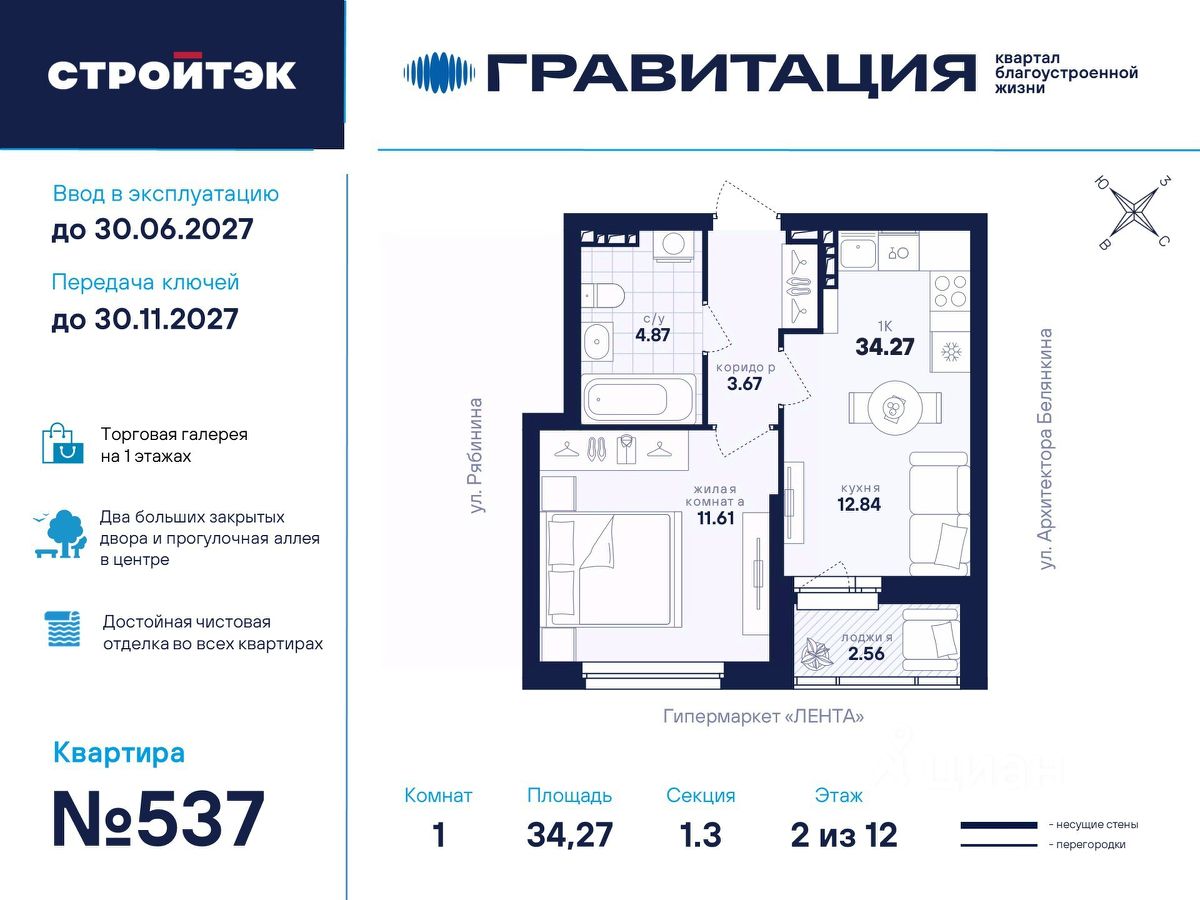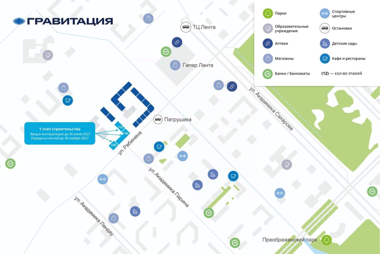 Удачные решения Новый квартал благоустроенной жизни ''Гравитация'' мы разместили в периметре улиц Рябинина и Академика Ландау. У квартала 5 этапов строительства, а всю работу мы завершим к 2030 году. Авторы проекта гармонично совместили в оформлении природные элементы и современный дизайн. Волнообразные очертания на стенах вдохновлены силой ветра и движением воды. Скруглённые углы подчеркивают элегантный силуэт, а контрастная палитра акцентов и контурная подсветка верхних этажей создают выразительный архитектурный образ. Первый этап строительства: — Секция 1.1 — 1 подъезд 26 этажей — Секция 1.2 — 2 подъезда 16 этажей — Секция 1.3 — 1 подъезд 12 этажей Здесь всё и сразу Гравитация — уютный и обособленный, и в то же время открытый и просторный квартал. Всё рядом: супермаркеты и парки, кино и рестораны, школы и сады. В нескольких шагах набережная реки Патрушихи. В квартале построят муниципальный детский сад на 200 мест, а на 5 этапе строительства мы возведём 6-уровневый надземный паркинг на 250 машин. На первых этажах домов для вас будет работать торговая галерея с магазинами, кафе и привычными бытовыми сервисами. В 1 этапе строительства 631 квартира. Своя вселенная Развитый Академический район удобен и молодым семьям, и школьникам, и состоявшимся профессионалам. Рядом большой Преображенский парк с озером и Юго-Западный лесопарк с Тропой здоровья. — 3 минуты до Гипер Ленты — 10 минут на машине до ТРЦ ''Академический'', 15 минут до ЕКАД, 25 до центра — 6 школ и 6 детских садов — Спортивные комплексы и клубы Wake up, Bright Fit и Юность Богатые возможности В квартале два просторных закрытых двора общей площадью 1,4 гектара. Один двор объединяет 1 и 2 этапы строительства, другой — 3, 4 и 5 этапы. Между дворами — камерная прогулочная аллея для неспешных вечеров или полуденного отдыха. Во дворе первого этапа — зелёные участки из хвойных деревьев, акцентных кустарников и травянистых многолетников, а также сеть дорожек, детская площадка с песочницей, аттракционами и геопластикой, настольный теннис и зона для зарядки. А для комфорта и безопасности — вечернее освещение, охрана и постоянное видеонаблюдение. Пространство с заботой В просторных светлых лобби Гравитации — интеллигентный дизайн, помещения для колясок, высокие витражи и комфортная мебель. Выходы сквозные, на улицу и во двор. Лифты грузоподъёмностью 1000 и 450 кг. Мы подготовили для вас 44 уникальных варианта продуманных планировок, в том числе с кухнями-гостиными, гардеробными и мастер-спальнями. Здесь нет бесполезных зон, зато есть где посидеть в семейном кругу и разместить всё для удобства и комфорта. Современные технологии Мы позаботились о достойной чистовой отделке, чтобы вы могли уделить время главному. — Виниловые обои на флизелиновой основе, окрашенные стены в санузлах и на лоджиях — Натяжные потолки везде, кроме лоджий, там — окрашенные — Прочный влагостойкий ламинат и керамическая плитка — Межкомнатные двери светлых тонов и сейф-дверь на входе — Эргономичное размещение розеток и выключателей