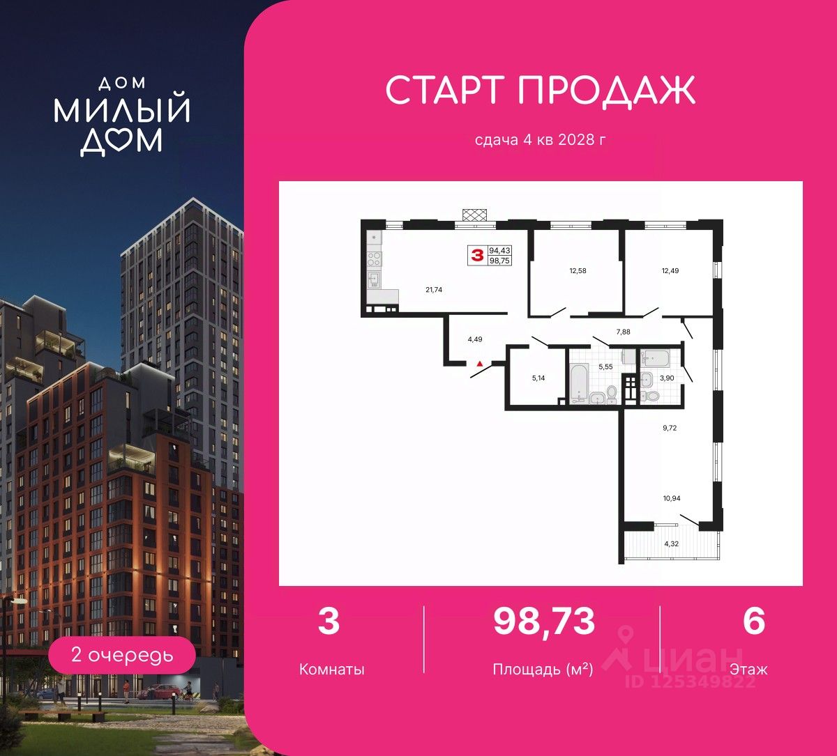 Продается 3-комн. квартира от застройщика с предчистовой отделкой в ЖК ''Милый дом'' на 6 этаже. Общая площадь: 98.73 кв.м., жилая: 45.73 кв.м., площадь просторной кухни-столовой: 21.74 кв.м. Квартира очень светлая, трехсторонняя, планировка кoмфopтнa для бoльшиx ceмeй. В квартире один балкон, два совмещенных санузла. Высота потолков 2.7 м. Квартира находится в корпусе 2.4. Дом монолитный, одноподъездный, высотой 13 этажей. На этаже 4 квартиры. В подъезде 1 пассажирский и 1 грузовой лифт. Окончание строительства - 4 квартал 2028 года. Оформление сделки по договору долевого участия. Дом ''Милый дом'' — это проект комфорт-класса от застройщика BAZA Development, расположенный на Юго-Западе. Жилой комплекс включает две очереди с подземным паркингом, автомойкой, общественными пространствами и пешеходной аллеей длиной в семь кварталов. Это дом, где всё включено. Вместо поездок в отели 5, мы предлагаем комфортное проживание в ''Милом доме'', где любой вопрос решается нажатием кнопки лифта. Жителей и гостей первой очереди на улице встречает фотогеничное пространство — плаза с качелями, шезлонгами и арт-объектом, внутри — огромное лобби с круглосуточным ресепшеном, сотрудником управляющей компании и кофейней DUO. В проекте второй очереди предусмотрены детский клуб и спортзал. На 30 этаже первой очереди расположен комьюнити-центр с панорамным видом на город. Это бесплатное общественное пространство для работы, встреч и отдыха с друзьями, где можно провести время от фортепианного вечера до гриля. Вас ждут переговорки, чилл-аут зона, кухня и гриль-зона. На подземных этажах находится тёплый паркинг и автомойка. Вы можете привезти авто сами или воспользоваться услугами ресепшена — мы заберём машину, помоем и вернём обратно. ''Милый дом'' открывает застройку семи кварталов, создавая ''новый центр города''. Главная зелёная артерия района — прогулочная аллея, идеальная для вечерних прогулок и встреч с друзьями. Команда УК BAZA — одно из подразделений застройщика. Офис УК находится прямо в доме. Каждый месяц УК измеряет индекс лояльности с помощью telegram-бота, в прямом эфире проводятся online-собрания, а для жителей есть удобное приложение, чтобы оплатить коммунальный услуги и оставить обращение. Также УК организует праздники, мероприятия и мастер-классы для жителей. #ZMbeu5
