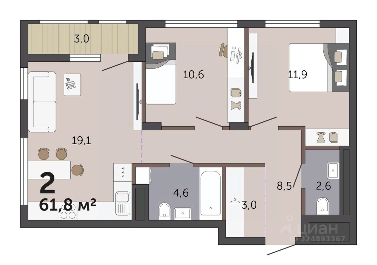 Продаётся квартира площадью 58.86 м2 в жилом комплексе ''Эхо леса''. Квартира находится на 7 этаже, жилая площадь квартиры 20.49 м2, площадь просторной кухни — 19.59 м2. Среди особенностей планировки — изолированные комнаты с окнами на одну сторону, 1 совмещённый санузел. Срок сдачи — I кв. 2028 Жилой комплекс ''Эхо леса'' — это: - дом в эко-стиле - двор с выходом в лесопарк - лаконичная архитектура - развитая инфраструктура вокруг квартала Инфраструктура В окружении проекта — вся необходимая инфраструктура: детские сады, школы, спортивный комплекс, продуктовые магазины, аптеки, кофейни, рестораны и салоны красоты. Благоустройство Концепция двора-парка продолжает тему леса. Ландшафт с продуманным всесезонным озеленением дополняют акценты: сухой ручей из камней, столы и навесы из натурального дерева, эко-тропы, фонтан и променад. Для взрослых предусмотрены пешеходные и велодорожки, для детей — игровые площадки для разных возрастов. Архитектура Переменная высота секций создаёт выразительный архитектурный облик. На фасадах — игра контрастных, при этом природных оттенков. Динамики зданию придают текстуры материалов: фактурной штукатурки и клинкерного кирпича. Лобби Интерьер в холле продолжает концепцию квартала и выполнен в эко стиле. В отделке используются элементы природных материалов с изображениями листвы и деревьев. Паркинг Тёплый подземный паркинг организован как единое пространство с собственным дизайном. Кладовые Индивидуальные помещения на техническом этаже — способ сохранить пространство в квартире. Попасть в кладовые можно на лифте. Планировки В продуманных планировках выделены тихие и шумные зоны. Приватные спальни и кабинеты спрятаны от маршрутов домашнего движения, а кухни-гостиные с барной стойкой вместо стены — всегда готовы к семейным праздникам. Из окон квартир открываются живописные виды на лес.