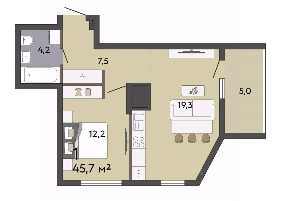 45 м² · Этаж 12 из 19