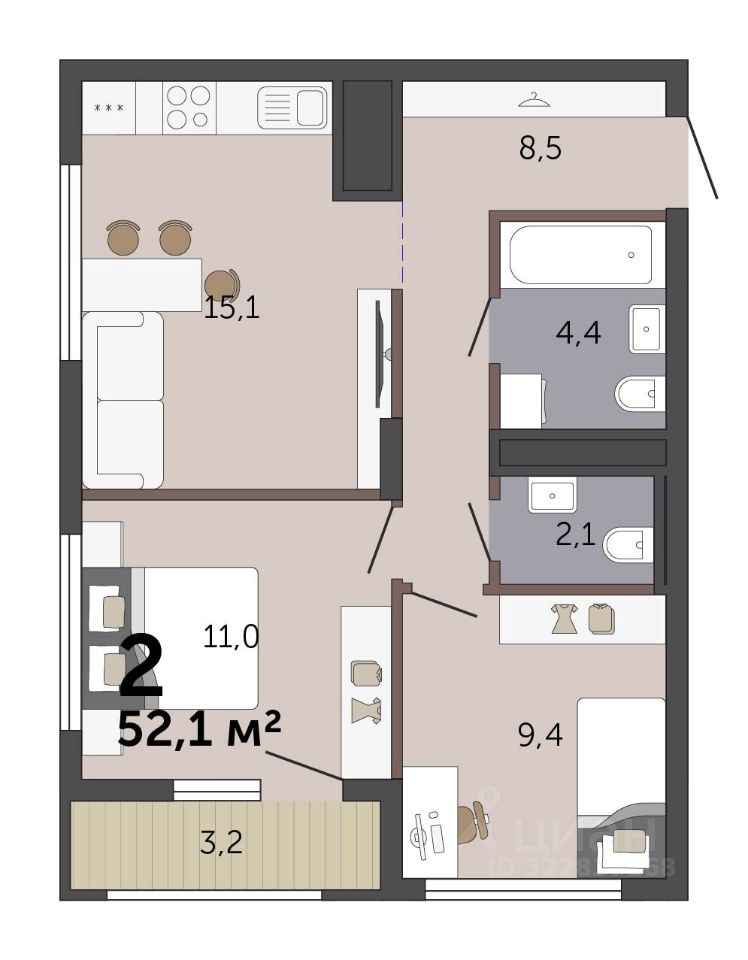 52 м² · Этаж 15 из 19