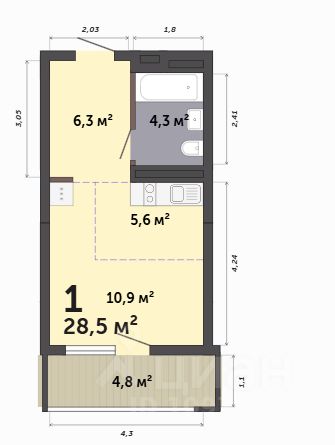 Квартира находится в ЖК ''Бодровский'' от федерального застройщика ''Паритет Девелопмент''. Это жилой комплекс комфорт-класса с современной архитектурой, расположенный в Екатеринбурге в районе улиц Патриса Лумумбы и 2-й Новосибирской. Добраться от него до центра города можно всего за 25 минут, дорога до ЕКАДа займет 12 минут. В окружении жилого комплекса есть шесть детских садов, пять школ, три больших парка, пять спорткомплексов, в том числе курортный комплекс Уктус. Квартал состоит из двух секций переменной этажности (от 14 до 24 этажей) и подземного паркинга с кладовыми, к которым можно будет спуститься на лифте. На первых этажах предусмотрены коммерческие помещения: жители смогут сделать маникюр, воспользоваться услугами ателье, выпить кофе с круассаном, не покидая своего района. Ввод в эксплуатацию в III кв. 2027 года. Территория комплекса огорожена от машин и посторонних людей. Озеленение с многолетними растениями и деревьями создает ощущение близости к природе. Двор наполнен всем необходимым: песочницы и качели для самых маленьких, интерактивная башня для детей постарше, воркаут-зона и места для отдыха. На всей территории реализована безбарьерная среда. В парадных выполнен авторский ремонт. За счет панорамного остекления и 4-метровых потолков там всегда много естественного света. Предусмотрены колясочные с местами для хранения спортинвентаря и креплениями для велосипедов. В проекте представлены студии, классические одно- и двухкомнатные варианты, а также двух-, трех- и четырехкомнатные квартиры в евроформате площадью от 25,32 до 76,65. Все планировки — функциональные и подходящие новоселам как с детьми, так и без них. Есть варианты с лоджиями, где можно организовать дополнительное пространство для отдыха, спорта или работы, а еще квартиры с мастер-спальней, гардеробной, двумя санузлами. В каждой предусмотрена вытяжная вентиляция с естественным побуждением, счетчики с телеметрией и корзины для кондиционеров. Характеристики квартиры: этаж - 4 количество комнат - 1 номер помещения - 22 площадь квартиры - 28,3 кв.м Чтобы сэкономить время и деньги, можно приобрести квартиру сразу с ремонтом от застройщика. На выбор 3 конфигурации: базовый, с кухонным гарнитуром, с кухонным гарнитуром и другой мебелью - в светлом и темном оттенках. Ремонт можно включить в ипотеку.
