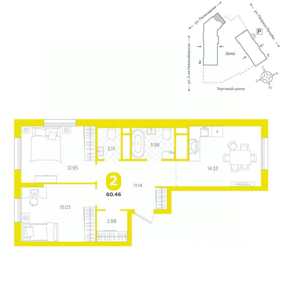 Квартира находится в ЖК ''Бодровский'' от федерального застройщика ''Паритет Девелопмент''. Это жилой комплекс комфорт-класса с современной архитектурой, расположенный в Екатеринбурге в районе улиц Патриса Лумумбы и 2-й Новосибирской. Добраться от него до центра города можно всего за 25 минут, дорога до ЕКАДа займет 12 минут. В окружении жилого комплекса есть шесть детских садов, пять школ, три больших парка, пять спорткомплексов, в том числе курортный комплекс Уктус. Квартал состоит из двух секций переменной этажности (от 14 до 24 этажей) и подземного паркинга с кладовыми, к которым можно будет спуститься на лифте. На первых этажах предусмотрены коммерческие помещения: жители смогут сделать маникюр, воспользоваться услугами ателье, выпить кофе с круассаном, не покидая своего района. Ввод в эксплуатацию в III кв. 2027 года. Территория комплекса огорожена от машин и посторонних людей. Озеленение с многолетними растениями и деревьями создает ощущение близости к природе. Двор наполнен всем необходимым: песочницы и качели для самых маленьких, интерактивная башня для детей постарше, воркаут-зона и места для отдыха. На всей территории реализована безбарьерная среда. В парадных выполнен авторский ремонт. За счет панорамного остекления и 4-метровых потолков там всегда много естественного света. Предусмотрены колясочные с местами для хранения спортинвентаря и креплениями для велосипедов. В проекте представлены студии, классические одно- и двухкомнатные варианты, а также двух-, трех- и четырехкомнатные квартиры в евроформате площадью от 25,32 до 76,65. Все планировки — функциональные и подходящие новоселам как с детьми, так и без них. Есть варианты с лоджиями, где можно организовать дополнительное пространство для отдыха, спорта или работы, а еще квартиры с мастер-спальней, гардеробной, двумя санузлами. В каждой предусмотрена вытяжная вентиляция с естественным побуждением, счетчики с телеметрией и корзины для кондиционеров. Характеристики квартиры: этаж - 8 количество комнат - 2 номер помещения - 225 площадь квартиры - 60,46 кв.м Чтобы сэкономить время и деньги, можно приобрести квартиру сразу с ремонтом от застройщика. На выбор 3 конфигурации: базовый, с кухонным гарнитуром, с кухонным гарнитуром и другой мебелью - в светлом и темном оттенках. Ремонт можно включить в ипотеку.