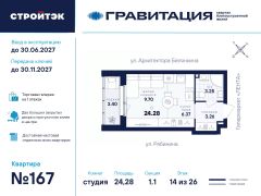 Удачные решенияНовый квартал благоустроенной жизни ''Гравитация'' мы разместили в периметре улиц Рябинина и Академика Ландау. У квартала 5 этапов строительства, а всю работу мы завершим к 2030 году.Авторы проекта гармонично совместили в оформлении природные элементы и современный дизайн. Волнообразные очертания на стенах вдохновлены силой ветра и движением воды. Скруглённые углы подчеркивают элегантный силуэт, а контрастная палитра акцентов и контурная подсветка верхних этажей создают выразительный архитектурный образ.Первый этап строительства:— Секция 1.1 — 1 подъезд 26 этажей— Секция 1.2 — 2 подъезда 16 этажей— Секция 1.3 — 1 подъезд 12 этажейЗдесь всё и сразуГравитация — уютный и обособленный, и в то же время открытый и просторный квартал. Всё рядом: супермаркеты и парки, кино и рестораны, школы и сады. В нескольких шагах набережная реки Патрушихи.В квартале построят муниципальный детский сад на 200 мест, а на 5 этапе строительства мы возведём 6-уровневый надземный паркинг на 250 машин. На первых этажах домов для вас будет работать торговая галерея с магазинами, кафе и привычными бытовыми сервисами.В 1 этапе строительства 631 квартира.Своя вселеннаяРазвитый Академический район удобен и молодым семьям, и школьникам, и состоявшимся профессионалам. Рядом большой Преображенский парк с озером и Юго-Западный лесопарк с Тропой здоровья.— 3 минуты до Гипер Ленты— 10 минут на машине до ТРЦ ''Академический'', 15 минут до ЕКАД, 25 до центра— 6 школ и 6 детских садов— Спортивные комплексы и клубы Wake up, Bright Fit и ЮностьБогатые возможностиВ квартале два просторных закрытых двора общей площадью 1,4 гектара. Один двор объединяет 1 и 2 этапы строительства, другой — 3, 4 и 5 этапы. Между дворами — камерная прогулочная аллея для неспешных вечеров или полуденного отдыха.Во дворе первого этапа — зелёные участки из хвойных деревьев, акцентных кустарников и травянистых многолетников, а также сеть дорожек, детская площадка с песочницей, аттракционами и геопластикой, настольный теннис и зона для зарядки.А для комфорта и безопасности — вечернее освещение, охрана и постоянное видеонаблюдение.Пространство с заботойВ просторных светлых лобби Гравитации — интеллигентный дизайн, помещения для колясок, высокие витражи и комфортная мебель. Выходы сквозные, на улицу и во двор. Лифты грузоподъёмностью 1000 и 450 кг.Мы подготовили для вас 44 уникальных варианта продуманных планировок, в том числе с кухнями-гостиными, гардеробными и мастер-спальнями. Здесь нет бесполезных зон, зато есть где посидеть в семейном кругу и разместить всё для удобства и комфорта.Современные технологииМы позаботились о достойной чистовой отделке, чтобы вы могли уделить время главному.— Виниловые обои на флизелиновой основе, окрашенные стены в санузлах и на лоджиях— Натяжные потолки везде, кроме лоджий, там — окрашенные— Прочный влагостойкий ламинат и керамическая плитка— Межкомнатные двери светлых тонов и сейф-дверь на входе— Эргономичное размещение розеток и выключателей