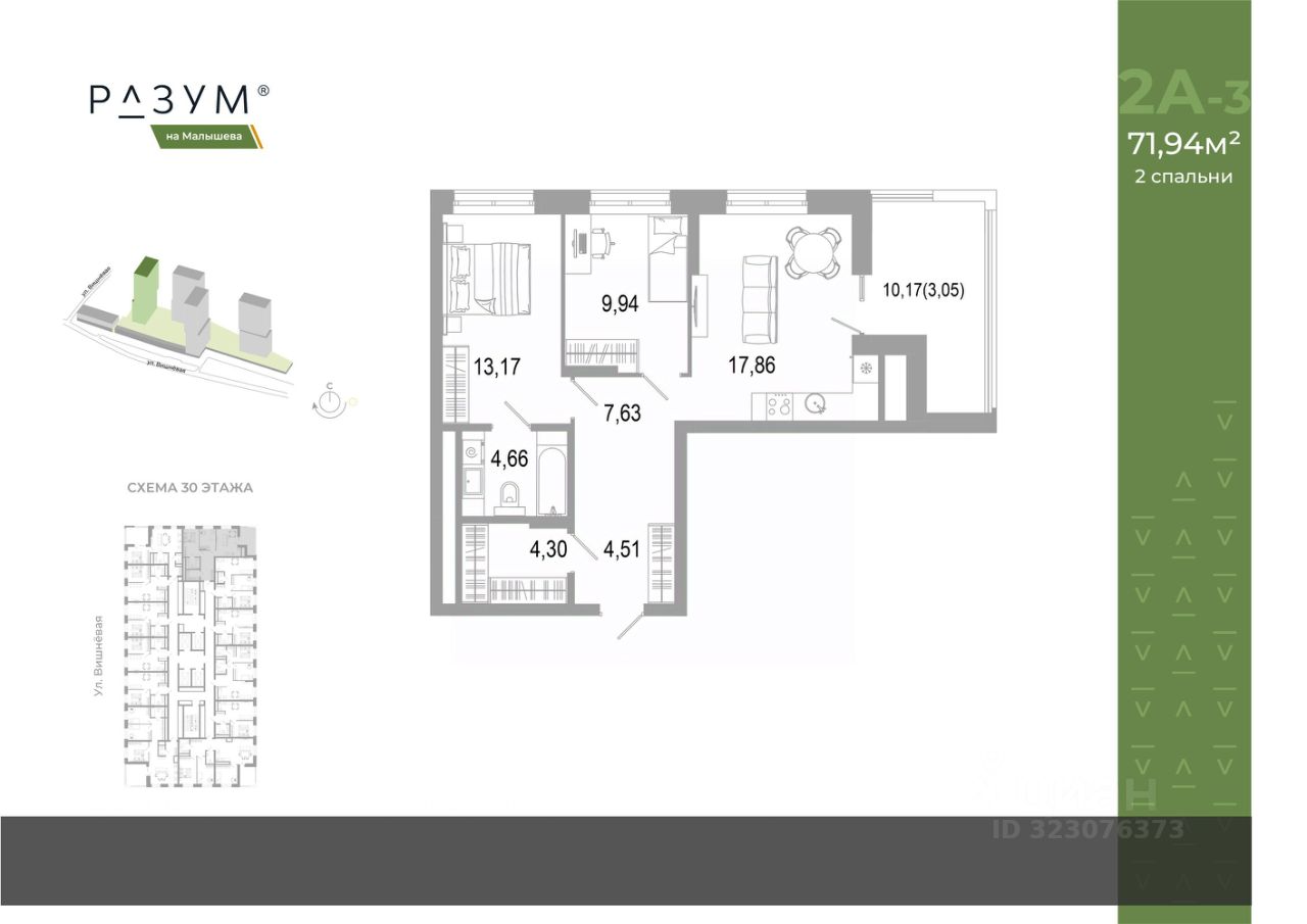 ''РАЗУМ на Малышева'' — новый проект от федерального девелопера с 12-летним опытом. Квартал расположен в самом сердце Екатеринбурга в Кировском районе. В шаговой доступности: 8 детских садов, 7 школ, прогулочные зоны и парки, магазины, учреждения профессионального образования. ''РАЗУМ на Малышева'' — это четыре 31-этажных башен на улице Малышева. Дополнительная приватность, безопасность и тишина создаётся за счёт возвышения домов на стилобате. Балконы на фасадах открывают виды на город и во двор, а угловые террасы открывают ещё больше простора и потрясающих видов. Жители квартала ''РАЗУМ на Малышева'' наслаждаются зелёными зонами круглый год. 60% территории занимает озеленение с деревьями, кустарниками и многолетниками. Здесь прогулки, отдых, работа и встречи с друзьями проходят в уютных зонах с перголами, шезлонгами и гамаками. ''РАЗУМ на Малышева'' — это: развитая инфраструктура, эргономичные и яркие архитектурные решения, дополнительный уровень спокойствия за счет возвышения на стилобате, во дворе высажены деревья и кустарники с учетом 4 сезонов, многоуровневое освещение, благоустройство, высокий уровень безопасности, стильные гранд-лобби и ресепшн, особые панорамные виды, собственная управляющая компания, собственный детский сад на 150 мест, четырёхэтажный паркинг, соседский центр место развития добрососедства, коммерческие помещения. Эргономичность и удобство в каждом квадратном метре — основа планировочных решений в квартале ''РАЗУМ на Малышева''. Для каждого сценария жизни найдется планировка: представлены десятки вариантов от 29,92 м² до 84,88 м². Квартиры с террасами размещены на верхних этажах домов. Терраса — это дополнительное пространство для слияния с природой.