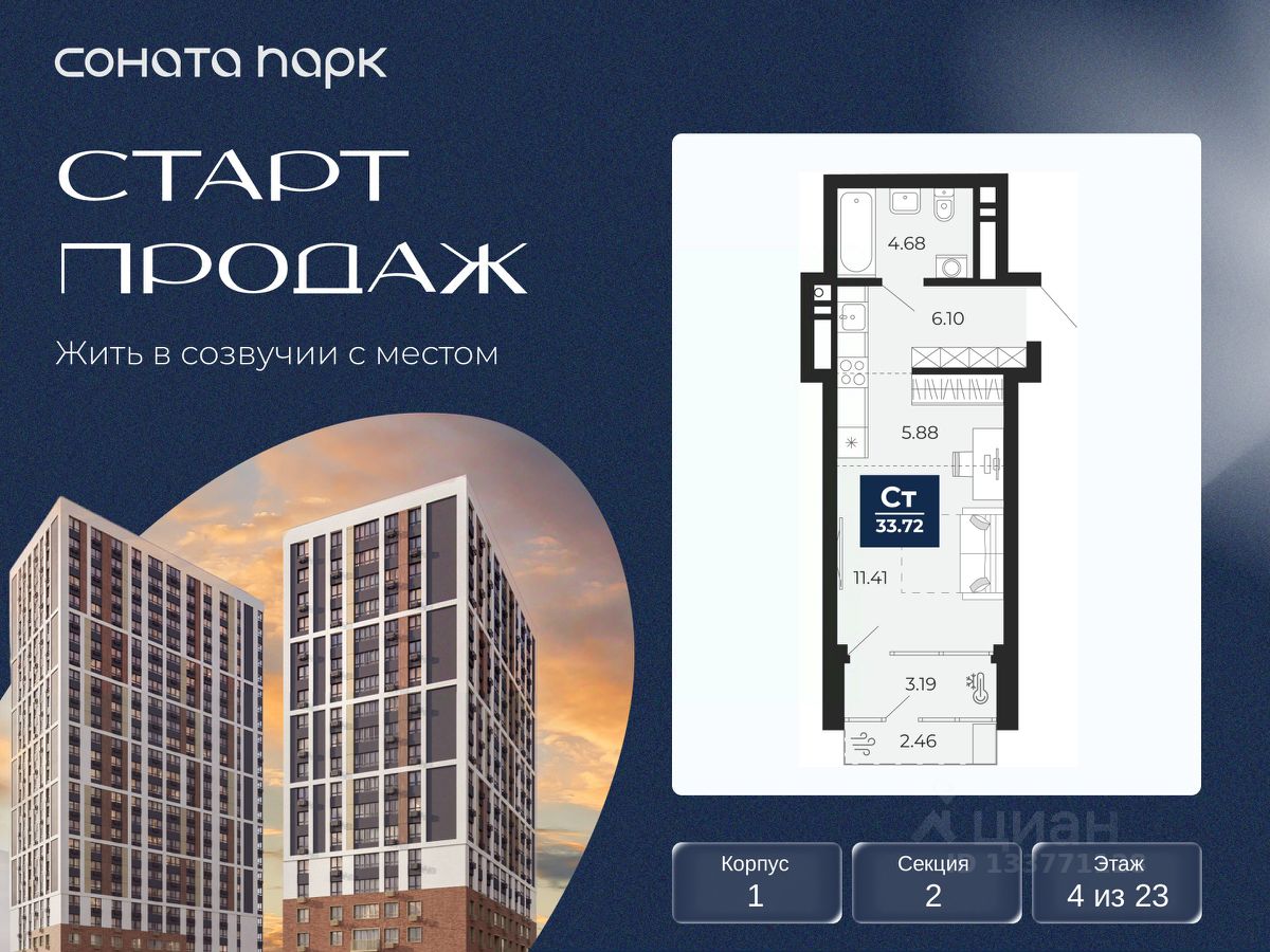 Продается однокомнатная квартира-студия от застройщика с предчистовой отделкой в ЖК ''Соната Парк'' на 4 этаже. Общая площадь: 30.41 кв.м., площадь гостиной 17.29 кв.м., из которых 5.88 кв.м. выделено под кухонную зону. Все окна выходят на одну сторону. В квартире один балкон, один совмещенный санузел. Высота потолков 2.72 м. Дом монолитный, двухподъездный, переменной этажности, от 23 до 30 этажей. Квартира находится во 2-й секции высотой 23 этажа в корпусе 1. На этаже 11 квартир. В подъезде 1 пассажирский и 2 грузовых лифта. Окончание строительства - 4 квартал 2028 года. Оформление сделки по договору долевого участия. ЖК ''Соната Парк'' расположен в новом городском кластере ''Аллея Романтиков'' на Юго-Западе Екатеринбурга. Это район улиц Волгоградская Советских женщин Шаумяна Амудсена. Аллея объединяет разные кварталы застройщиков этой территории в единое целое. Чистые линии, интеллектуальная элегантность фасадов, игра света и тени это партитура, написанная архитектором. Благоустройство жилого комплекса это синтез искусства и природы. Поющие музыкальные инсталляции и поэтический променад. Оркестр растений: сирень, гортензии и яблони, чья цветущая палитра сменяется в течение года. Жизнь с готовой инфраструктурой Развитая транспортная доступность и социальная среда: уже сегодня рядом с домом детские сады, школы, парковые зоны, супермаркеты и рестораны в шаговой доступности. Технологии безопасности Для спокойствия жителей создана интеллектуальная система безопасности. Круглосуточный визуальный контроль обеспечивают профессиональная служба охраны, постоянно присутствующая на территории, и ситуационный центр. Система видеонаблюдения охватывает каждый уголок комплекса, исключая ''слепые'' зоны. Чёткое зонирование и навигация дополняют картину полного порядка. Дизайнерские подъезды Стилистика подъездов продолжает концепцию ''Соната Парка'', вдохновлённого музыкальной симфонией: сдержанный, но при этом впечатляющий дизайн соседствует с удобством и функциональностью. В подъезде вас встречает музыка, создавая особую атмосферу с первых секунд. Светлые и стильные входные группы с панорамным остеклением наполняют пространство светом, добавляя ему современной эстетики и ощущения безопасности. Аллея Романтиков Проект органично вписан в масштабный пешеходный кластер ''Аллея Романтиков'' — уникальное общегородское пространство, которое уже сегодня называют будущей альтернативой главным прогулочным улицам города. Это многофункциональный бульвар протяжённостью 1 километр, где всё создано для вдохновения и отдыха. Это ''зелёное сердце'' территории, которое объединит кварталы разных застройщиков в единую гармоничную среду. Здесь будут назначать свидания, гулять с семьёй, встречаться с друзьями и просто наслаждаться моментом. Линейка ремонтов Ремонт с капсульной меблировкой — когда всё готово к жизни. Мы соединили качественный ремонт и продуманную меблировку в одном флаконе. Словно ''с иголочки'', новая квартира готова и обставлена с чувс