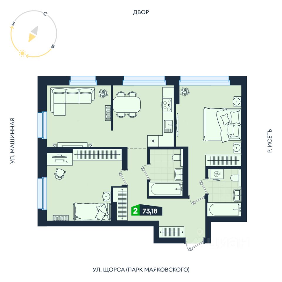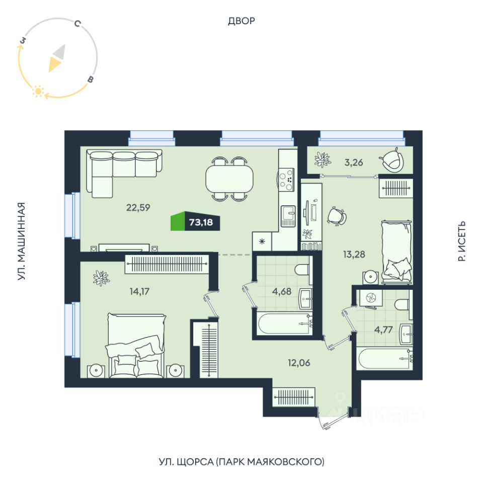 Продаётся 2-комнатная квартира в строящемся доме (Секции 2.3-2.4), срок сдачи: I-кв. 2032, общей площадью 73.3 кв.м., на 16 этаже. Жилои квартал ''Никольскии'' — проект, созданный для комфортной жизни и счастливых событий. Это жизнь бизнес-класса в центральном районе Екатеринбурга. ЖК ''Никольский'' расположен в центре города на пересечении улиц Фурманова — Белинского — Большакова и набережной реки Исеть. В 5 минутах пешей прогулки расположен центральный парк культуры и отдыха им. В.В. Маяковского Общественные пространства дома выполнены по авторскому дизайн-проекту. Просторные холлы, наполненные светом, сочетание крупноформатного керамогранита, эксклюзивных элементов интерьера и декоративной подсветки создают ощущение роскоши, подобно лобби пятизвездочного отеля. Для комфортной и счастливой жизни резидентов реализованы премиальные инженерные решения и функциональная внутренняя инфраструктура: теплый подземный паркинг, комнаты для хранения колясок и велосипедов с отдельным входом, душ для домашних питомцев и локеры для хранения сезонных и габаритных вещей. На первых этажах дома будут расположены фитнес-клуб с бассейном и детским фитнесом, медицинский центр ''УГМК-Здоровье'' и аптека, салон красоты, супермаркеты и магазины, пункты выдачи маркетплейсов, пекарня и пиццерия, винотеки. В шаговой доступности: детский сад 463 и школа 17 с углублённым изучением отдельных предметов. Всегда можно прогуляться на свежем воздухе — по соседству находятся центральный парк культуры и отдыха им. В.В. Маяковского и парк им. Павлика Морозова. На шоппинг и за развлечениями Вас ждут в торгово-развлекательном центре ''Гринвич''. Здесь же расположены цирк, дендропарк, ледовая арена ''УГМК-Арена'', спортивный комплекс ''Юность'', четыре высших учебных заведения, гостиницы, офисы ведущих компаний, а также здания районной, городской и областной администраций. Возможность провести бесплатную перепланировку от застройщика зависит от графика производства строительных работ. Необходимо уточнять возможность в центре продаж.