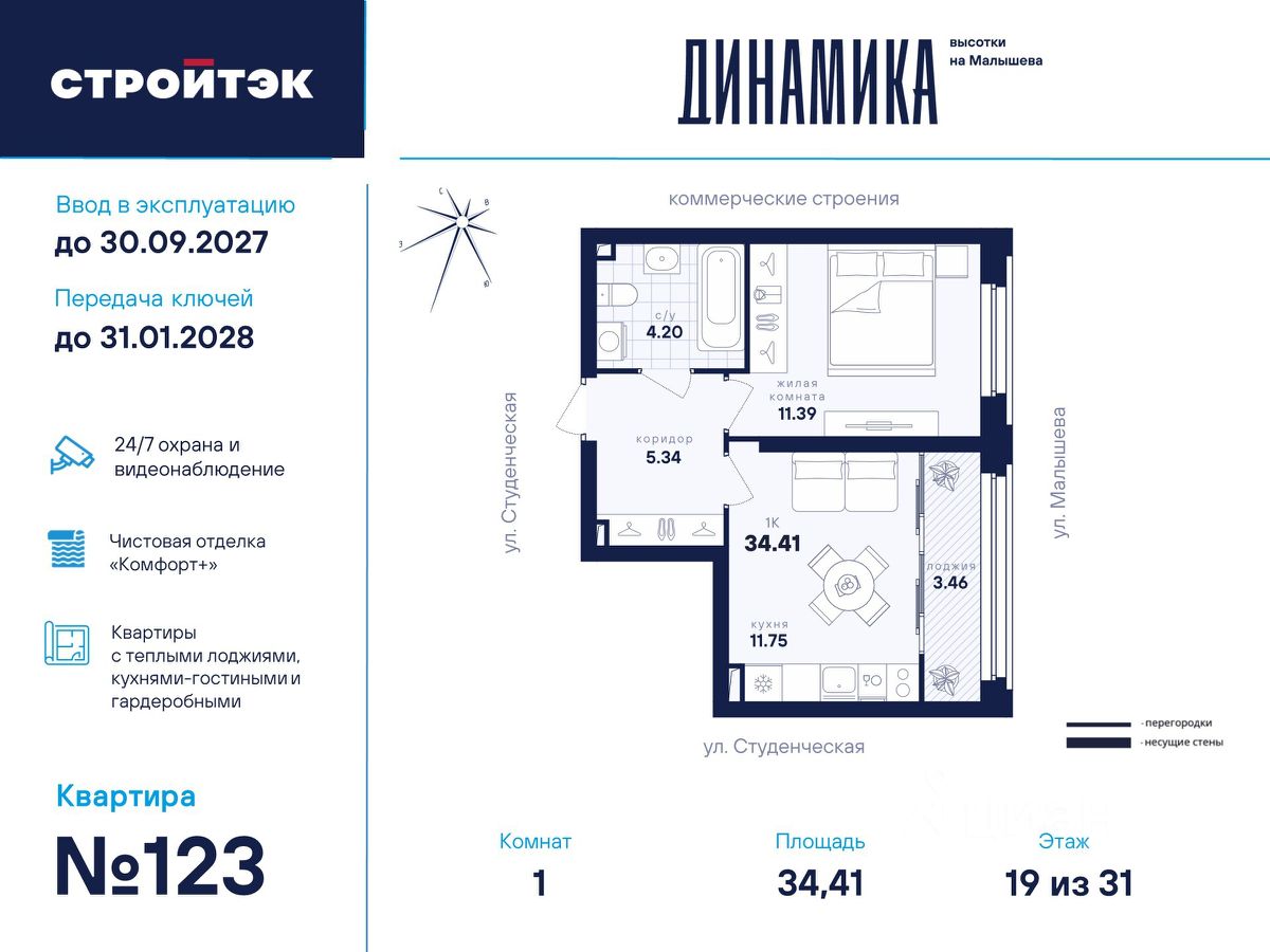 Настройте жизнь на максимум В Динамике воплощают мечты. Её фасады стремятся ввысь и рисуют силуэт ступеней — символа вашего движения, где всё задуманное сбывается. В интеллигентном микрорайоне Втузгородок всё под рукой. Пешком до остановки 5 минут, на машине до центра — 10. Соседство с торговыми комплексами и доступность ЕКАД входят в число преимуществ квартала наравне с близостью УРФУ, театров, школ и детсадов. Выгляните в окно — и увидите озеро Шарташ, которому около миллиона лет. Здесь катаются на сапах, лодках и катамаранах, а в Шарташском лесопарке вокруг озера — на велосипедах летом и лыжах зимой. Новое звучание района Выразительные башни Динамики притягивают взгляды издалека. Сплошные стеклянные витражи фасадов меняют восприятие проекта в зависимости от ракурса, времени года и суток. В квартирах с витражным остеклением оконные рамы и широкие подоконники визуально увеличивают пространство. Благодаря современным технологиям витражи обеспечивают дополнительную теплоизоляцию, помогая сохранять комфортный микроклимат в квартире и летом, и зимой. Отдых в вашем ритме Выбирайте досуг по душе для себя и семьи. Занимайтесь на тренажёрах и воркаут-комплексе, играйте в пинг-понг, футбол или баскетбол. А детей предоставьте насыщенному плейхабу, который тренирует тактильность и равновесие в атмосфере безопасности и контролируемого риска. Размеренно прогуливайтесь меж декоративных холмов, под тенистыми навесами-перголами вблизи удобных скамеек, многолетних трав и разновысотной уличной мебели. СТРОЙТЭК возводит Динамику в 3 этапа. Второй этап строительства В нём 2 секции. С2 — престижная высотка в 31 этаж. Здесь 209 квартир от 1- до 3-комнатных и 19 уникальных планировок с просторными кухнями-гостиными до 21 кв. м. Кроме того, закрытый паркинг на 31 место и 40 кладовых-келлеров внутри стилобата. В подъезде С2 — светлый холл с минималистичным дизайном бизнес-класса, помещения для колясок и самокатов, а также 3 лифта на 1 000 кг каждый. С4 — парадный 6-этажный дом с элегантной смещённой геометрией и витражным остеклением всех жилых этажей. Внизу расположено впечатляющее лобби с лаунж-зоной и стойкой ресепшен, атмосферная площадь для встреч и торговая галерея. В секции всего 34 квартиры в 16 планировках от студий до 3-комнатных. Это особый уровень респектабельной и неторопливой жизни. Технологии комфорта Обратите внимание на специальные форматы планировок с гардеробными и тёплыми лоджиями. Отдельно в С4 — на видовые квартиры с террасами на 5 и 6 этажах, а также лоты с мастер-спальнями, где у приватного пространства для отдыха своя ванная. Что касается отделки — в Динамике улучшенный стандарт ''Комфорт+''. Помимо привычных комфортных сантехники и электрики, в него входят оконные стёкла Energy Light, приточные клапаны вентиляции Air-Box, особо прочный ламинат 33 класса и устойчивые к многократной покраске виниловые обои. Белые межкомнатные двери и плинтусы лаконично подчеркнут любую цветовую гамму, а надёжная сейф-дверь добавит спокойствия и беззаботных моментов