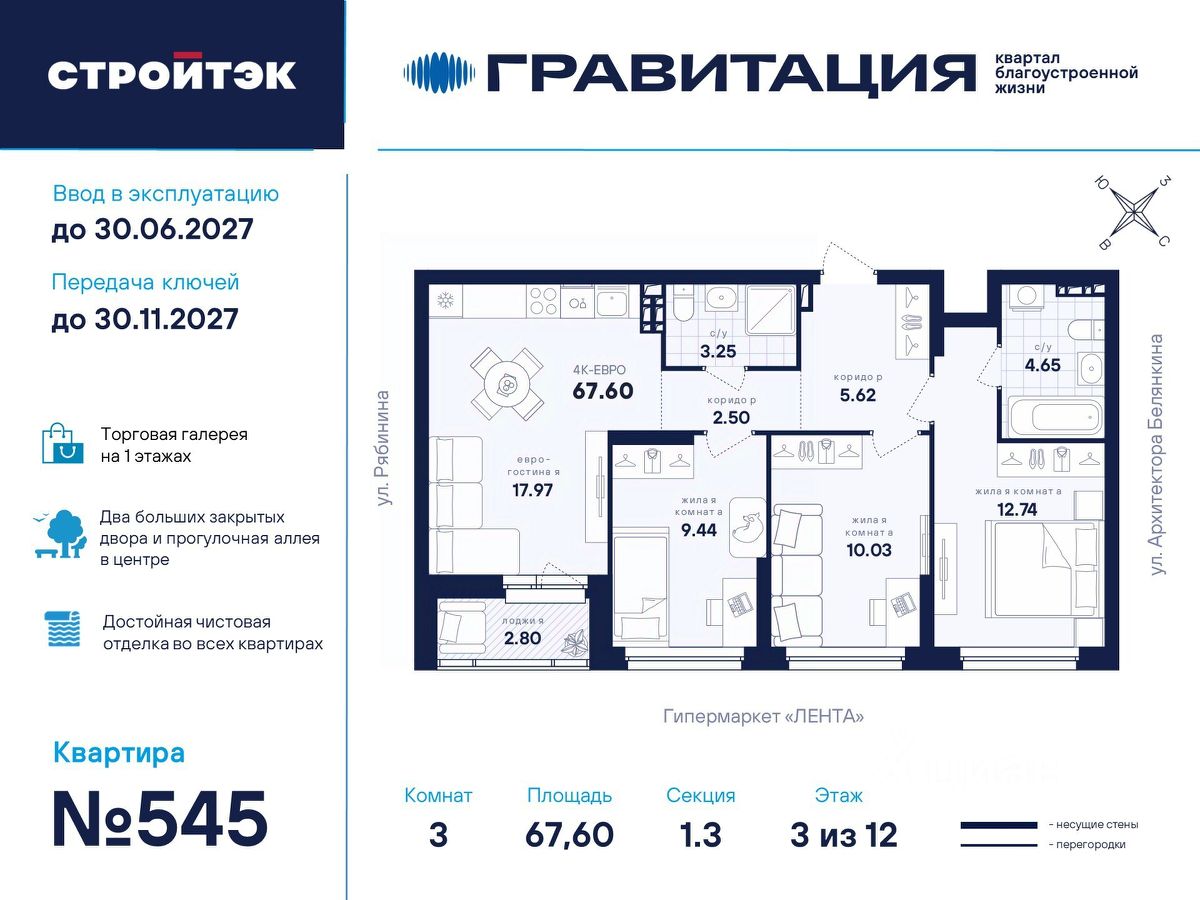 Удачные решения Новый квартал благоустроенной жизни ''Гравитация'' мы разместили в периметре улиц Рябинина и Академика Ландау. У квартала 5 этапов строительства, а всю работу мы завершим к 2030 году. Авторы проекта гармонично совместили в оформлении природные элементы и современный дизайн. Волнообразные очертания на стенах вдохновлены силой ветра и движением воды. Скруглённые углы подчеркивают элегантный силуэт, а контрастная палитра акцентов и контурная подсветка верхних этажей создают выразительный архитектурный образ. Первый этап строительства: — Секция 1.1 — 1 подъезд 26 этажей — Секция 1.2 — 2 подъезда 16 этажей — Секция 1.3 — 1 подъезд 12 этажей Здесь всё и сразу Гравитация — уютный и обособленный, и в то же время открытый и просторный квартал. Всё рядом: супермаркеты и парки, кино и рестораны, школы и сады. В нескольких шагах набережная реки Патрушихи. В квартале построят муниципальный детский сад на 200 мест, а на 5 этапе строительства мы возведём 6-уровневый надземный паркинг на 250 машин. На первых этажах домов для вас будет работать торговая галерея с магазинами, кафе и привычными бытовыми сервисами. В 1 этапе строительства 631 квартира. Своя вселенная Развитый Академический район удобен и молодым семьям, и школьникам, и состоявшимся профессионалам. Рядом большой Преображенский парк с озером и Юго-Западный лесопарк с Тропой здоровья. — 3 минуты до Гипер Ленты — 10 минут на машине до ТРЦ ''Академический'', 15 минут до ЕКАД, 25 до центра — 6 школ и 6 детских садов — Спортивные комплексы и клубы Wake up, Bright Fit и Юность Богатые возможности В квартале два просторных закрытых двора общей площадью 1,4 гектара. Один двор объединяет 1 и 2 этапы строительства, другой — 3, 4 и 5 этапы. Между дворами — камерная прогулочная аллея для неспешных вечеров или полуденного отдыха. Во дворе первого этапа — зелёные участки из хвойных деревьев, акцентных кустарников и травянистых многолетников, а также сеть дорожек, детская площадка с песочницей, аттракционами и геопластикой, настольный теннис и зона для зарядки. А для комфорта и безопасности — вечернее освещение, охрана и постоянное видеонаблюдение. Пространство с заботой В просторных светлых лобби Гравитации — интеллигентный дизайн, помещения для колясок, высокие витражи и комфортная мебель. Выходы сквозные, на улицу и во двор. Лифты грузоподъёмностью 1000 и 450 кг. Мы подготовили для вас 44 уникальных варианта продуманных планировок, в том числе с кухнями-гостиными, гардеробными и мастер-спальнями. Здесь нет бесполезных зон, зато есть где посидеть в семейном кругу и разместить всё для удобства и комфорта. Современные технологии Мы позаботились о достойной чистовой отделке, чтобы вы могли уделить время главному. — Виниловые обои на флизелиновой основе, окрашенные стены в санузлах и на лоджиях — Натяжные потолки везде, кроме лоджий, там — окрашенные — Прочный влагостойкий ламинат и керамическая плитка — Межкомнатные двери светлых тонов и сейф-дверь на входе — Эргономичное размещение розеток и выключателей