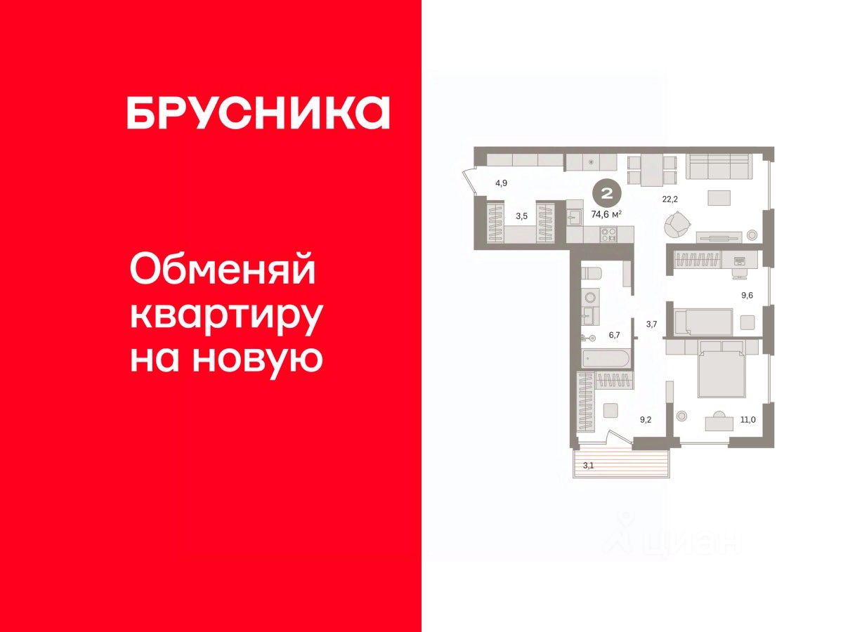 Успейте оформить бронирование по этой цене! Период акции ограничен! Стоимость квартиры указана со скидкой, ваша экономия составит 350,000 RUB. Звоните, мы вам все подробно расскажем! Просторная 3-комн. квартира с европланировкой и предчистовой отделкой в ЖК ''Квартал Траектория'' на 8 этаже. Общая площадь: 73.6 кв.м., жилая: 43.3 кв.м., общая площадь гостиной-столовой с кухонной зоной: 26.6 кв.м. Европланировка, кухня и гостиная объединены в одно просторное помещение. Комнаты изолированные, все окна выходят на одну сторону. В квартире одна лоджия, два совмещенных санузла. Высота потолков 2.82 м. Дом монолитный, многоподъездный, переменной этажности, от 7 до 16 этажей. Квартира находится в 4-й секции высотой 16 этажей в корпусе 1-2. На этаже 7 квартир. В подъезде 1 пассажирский и 1 грузовой лифт. Начало строительства - 4 квартал 2025 года. Окончание строительства - 4 квартал 2027 года. Оформление сделки по договору долевого участия. Квартира с кухней-гостиной и тремя спальнями в квартале ''Траектория''. Особенности планировки: предчистовая отделка, разнесённые спальни. квартиры в нашей базе: МНВ01-Ж12.8.5. Квартал ''Траектория'' строится в границах улиц Билимбаевской, Расточной, Монтажников и Маневровой Раньше здесь находился оборонный завод 5-ЦАРЗ, основанный в 1945 году. После войны он ремонтировал военную и грузовую технику — от ''Виллисов'' и ''Студебекеров'' до советских ЗИС-5 и ГАЗ-67. Сортировка — район с развитой инфраструктурой, обжитыми жилыми кварталами разных эпох и большим количеством парков. До центра Екатеринбурга — 20 минут на машине. Туда же можно отправиться на автобусе: ближайшая остановка общественного транспорта — в 4 минутах от ''Траектории''. Рядом с ''Траекторией'' расположены магазины, торговый центр, детские сады, школы, поликлиники и полезные сервисы, а также другой проект Брусники — квартал ''Депо''. Если хочется развлечений, можно отправиться в ТРЦ ''Карнавал'' и парк с аттракционами ''Таганская слобода'' — дорога туда займёт не более 10 минут на машине. Квартал ''Траектория'' — первый этап комплексного развития территории, которую раньше занимали производственные здания. На месте бывших цехов Брусника создаст дружелюбную среду и комфортное пешеходное пространство для всего района. Для озеленения квартала мы подобрали больше 60 видов растений: ольху, липу, клён, иву, грушу, вишню, сирень, барбарис, гортензию, смородину, ирис, декоративные травы. Они цветут в разное время года и постоянно меняют настроение двора. В ''Траектории'' мы предусмотрели несколько общественных пространств, открытых для всех горожан: встречающий сквер, лесопарк у храма и событийный сквер между домами. Когда захочется тишины и уединения, можно устроить прогулку во внутренних дворах: в них нет машин и посторонних, зато много зелени, света и мест для отдыха. Каждый двор в квартале ''Траектория'' — продолжение квартиры, только под открытым небом. Здесь можно прогуляться босиком по траве, устроить утреннюю йогу, почитать книгу в гамаке или отправить