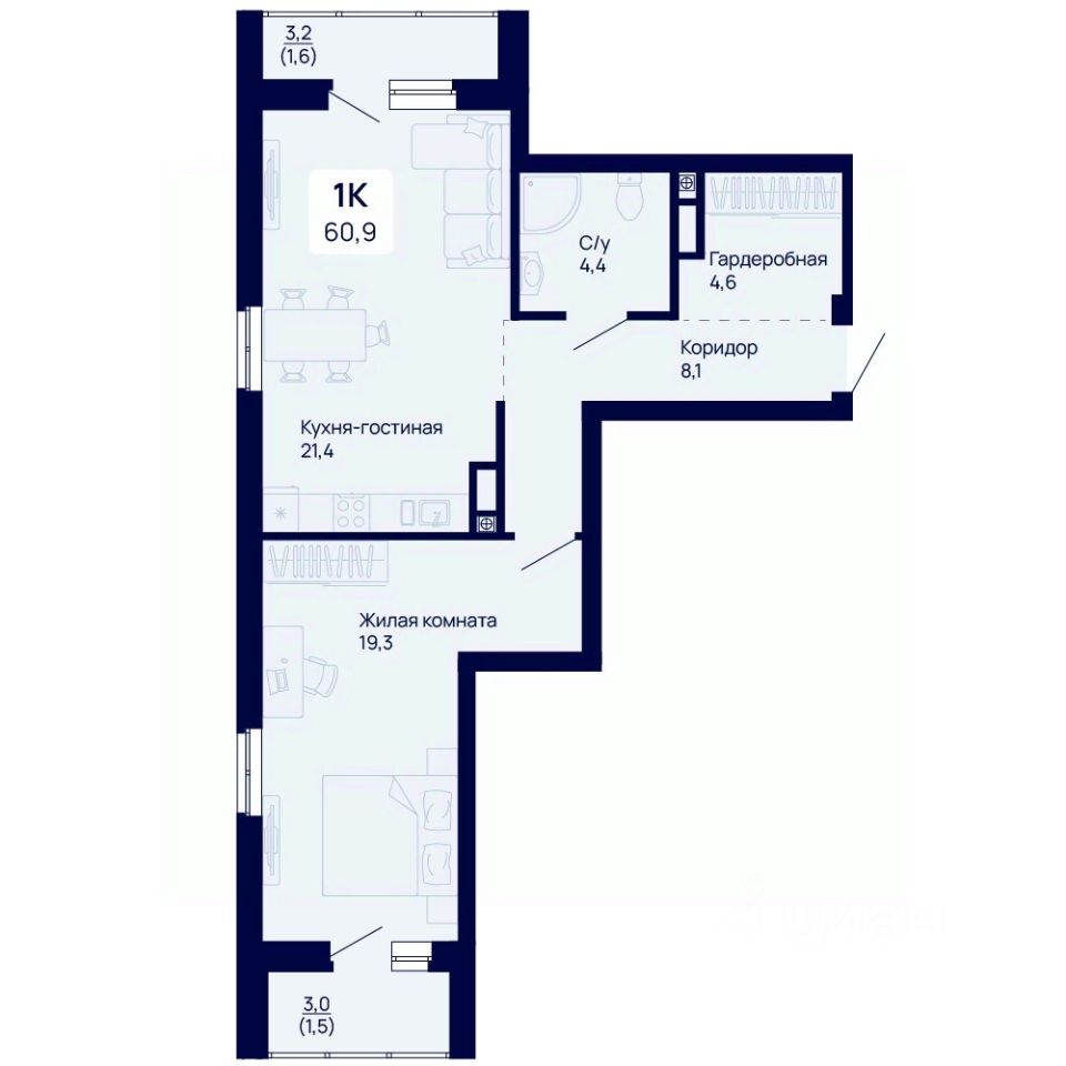 32 м² · Этаж 20 из 21