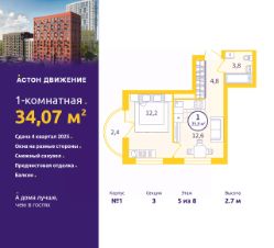 1-комн. квартира с предчистовой отделкой в ЖК ''Астон.Движение'' на 5 этаже. Общая площадь: 34.07 кв.м., жилая: 12.2 кв.м., площадь просторной кухни-столовой: 12.6 кв.м. Квартира угловая, окна oбecпeчивaют paвнoмepнoe ocвeщeниe в тeчeниe дня. В квартире один балкон, один совмещенный санузел. Высота потолков 2.7 м. Отделка white box - золотая середина между чистовой и черновой отделкой. В вашей квартире будут выполнены работы: стяжка пола, выровнены и оштукатурены стены, затерты швы на потолке, электроразводка во всех помещениях, полностью готовая система отопления, водопровод и канализация, установлена входная металлическая сейф-дверь. Дом монолитный, трехподъездный, переменной этажности, от 8 до 12 этажей. Квартира находится в 3-й секции высотой 8 этажей в корпусе 1. На этаже 9 квартир. В подъезде 1 грузовой лифт. Окончание строительства - 4 квартал 2025 года. Оформление сделки по договору долевого участия. Квартал Астон.Движение расположен в развивающейся части Новой Сортировки, на пересечении улицы Пехотинцев и переулка Проходной. Первая очередь 6 домов разной этажности, детский сад и бульвар с прогулочными аллеями в окружении зелени. В архитектуре отдано предпочтение отдельно стоящим секциям, благодаря чему получилась большая вариативность планировок, много видовых квартир с окнами на разные стороны, а постепенный набор высоты домов позволит наполнить солнечным светом каждую квартиру. Первые этажи домов соединяет большая галерея товаров и услуг для жителей и гостей квартала. Двор обустроен для приятного и неспешного движения. Полностью закрытый, без доступа автомобилей, с плавными линиями прогулочных тропинок. Игровые площадки для малышей и ребят постарше находятся на отдалении друг от друга. А взрослым можно разместиться в уютных беседках, на скамейках со столиками в тени деревьев или заняться спортом в уличном воркауте. В холлы организован безопасный безбарьерный доступ: нет риска получить травму или оступиться. Просторные лобби с современной дизайнерской отделкой, ресепшен, кофе-пойнтами и мягкими зонами наполнены светом и воздухом. Чистовая отделка включает: • В комнатах, коридоре и кухне — ламинат 32 класса на звукоизоляционной подложке. В ванной — напольная керамическая плитка,• Стены покрыты обоями и окрашены. В ванной влагостойкая краска нейтрального цвета,• Потолки зашпаклёваны и окрашены,• Установлены глухие межкомнатные двери одной модели,• Сантехника — раковина, унитаз и ванна. #ZWdzfm