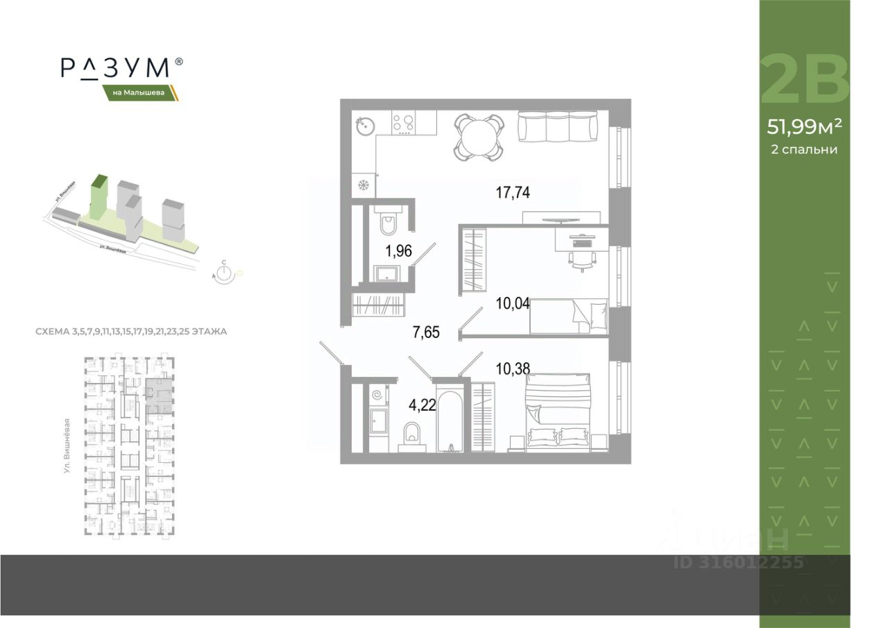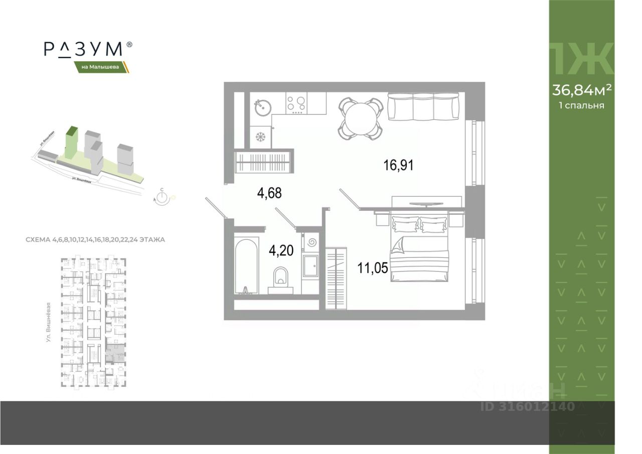 ''РАЗУМ на Малышева'' — новый проект от федерального девелопера с 12-летним опытом. Квартал расположен в самом сердце Екатеринбурга в Кировском районе. В шаговой доступности: 8 детских садов, 7 школ, прогулочные зоны и парки, магазины, учреждения профессионального образования. ''РАЗУМ на Малышева'' — это четыре 31-этажных башен на улице Малышева. Дополнительная приватность, безопасность и тишина создаётся за счёт возвышения домов на стилобате. Балконы на фасадах открывают виды на город и во двор, а угловые террасы открывают ещё больше простора и потрясающих видов. Жители квартала ''РАЗУМ на Малышева'' наслаждаются зелёными зонами круглый год. 60% территории занимает озеленение с деревьями, кустарниками и многолетниками. Здесь прогулки, отдых, работа и встречи с друзьями проходят в уютных зонах с перголами, шезлонгами и гамаками. ''РАЗУМ на Малышева'' — это: развитая инфраструктура, эргономичные и яркие архитектурные решения, дополнительный уровень спокойствия за счет возвышения на стилобате, во дворе высажены деревья и кустарники с учетом 4 сезонов, многоуровневое освещение, благоустройство, высокий уровень безопасности, стильные гранд-лобби и ресепшн, особые панорамные виды, собственная управляющая компания, собственный детский сад на 150 мест, четырёхэтажный паркинг, соседский центр место развития добрососедства, коммерческие помещения. Эргономичность и удобство в каждом квадратном метре — основа планировочных решений в квартале ''РАЗУМ на Малышева''. Для каждого сценария жизни найдется планировка: представлены десятки вариантов от 29,92 м² до 84,88 м². Квартиры с террасами размещены на верхних этажах домов. Терраса — это дополнительное пространство для слияния с природой.
