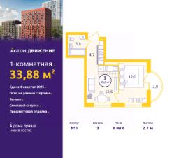 Однокомнатная квартира с предчистовой отделкой в ЖК ''Астон.Движение'' на 6 этаже. Общая площадь: 35.38 кв.м., жилая: 10.4 кв.м., площадь просторной кухни-столовой: 15 кв.м. Все окна выходят на одну сторону. В квартире одна лоджия, один совмещенный санузел. Высота потолков 2.7 м. Отделка white box - золотая середина между чистовой и черновой отделкой. В вашей квартире будут выполнены работы: стяжка пола, выровнены и оштукатурены стены, затерты швы на потолке, электроразводка во всех помещениях, полностью готовая система отопления, водопровод и канализация, установлена входная металлическая сейф-дверь. Дом монолитный, трехподъездный, переменной этажности, от 8 до 12 этажей. Квартира находится в 3-й секции высотой 8 этажей в корпусе 1. На этаже 9 квартир. В подъезде 1 грузовой лифт. Окончание строительства - 4 квартал 2025 года. Оформление сделки по договору долевого участия. Квартал Астон.Движение расположен в развивающейся части Новой Сортировки, на пересечении улицы Пехотинцев и переулка Проходной. Первая очередь 6 домов разной этажности, детский сад и бульвар с прогулочными аллеями в окружении зелени. В архитектуре отдано предпочтение отдельно стоящим секциям, благодаря чему получилась большая вариативность планировок, много видовых квартир с окнами на разные стороны, а постепенный набор высоты домов позволит наполнить солнечным светом каждую квартиру. Первые этажи домов соединяет большая галерея товаров и услуг для жителей и гостей квартала. Двор обустроен для приятного и неспешного движения. Полностью закрытый, без доступа автомобилей, с плавными линиями прогулочных тропинок. Игровые площадки для малышей и ребят постарше находятся на отдалении друг от друга. А взрослым можно разместиться в уютных беседках, на скамейках со столиками в тени деревьев или заняться спортом в уличном воркауте. В холлы организован безопасный безбарьерный доступ: нет риска получить травму или оступиться. Просторные лобби с современной дизайнерской отделкой, ресепшен, кофе-пойнтами и мягкими зонами наполнены светом и воздухом. Чистовая отделка включает: • В комнатах, коридоре и кухне — ламинат 32 класса на звукоизоляционной подложке. В ванной — напольная керамическая плитка,• Стены покрыты обоями и окрашены. В ванной влагостойкая краска нейтрального цвета,• Потолки зашпаклёваны и окрашены,• Установлены глухие межкомнатные двери одной модели,• Сантехника — раковина, унитаз и ванна. #Z6CI9D