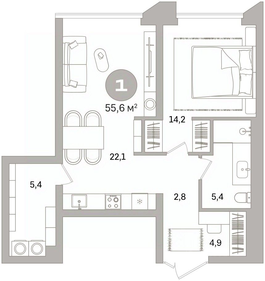 Квартира с кухней-гостиной и одной спальней в Северном квартале. Особенности планировки: предчистовая отделка. квартиры в нашей базе: СКВ04.2-Ж1.2.2. ''Северный квартал'' расположен в квадрате улиц Стачек, Войкова, Каширской и переулка Ритслянда. Проект находится на тихой территории между крупными городскими магистралями: проспектом Космонавтов и улицей Старых Большевиков, в 5 минутах пешком от метро ''Проспект Космонавтов''. Помимо транспортной доступности район имеет развитую инфраструктуру: торговые центры, продуктовые магазины, аптеки, кафе, поликлиники, детские центры и другие повседневные сервисы рядом. Оживлённое уличное движение останется за пределами квартала, а внутри создается собственная природная среда с зонами для вечерних прогулок, расслабленного отдыха, спорта и игр. Между домов проходит широкий пешеходный бульвар с разнообразным ландшафтом. Он объединяет общественные пространства между кварталами и переходит в площадь-сквер с фонтаном. Проект благоустройства связывает приватные дворы кварталов, парковое пространство вокруг урбан-вилл, игровые комплексы для детей разных возрастов и спортивные площадки в единый ландшафт. Внутриквартальный двор тихий и спокойный. За счёт разной этажности и арок во дворе — много света. Здесь будет высажено до 40 видов растений — деревья, кустарники, цветы, злаковые травы и газон. Деревья привезут уже взрослыми со сформированной кроной. Растения цветут в разное время года, имеют разную плотность и высоту. Всё это сделано для того, чтобы двор был разнообразным и в каждое время года имел свой цвет. #Zm2tFU