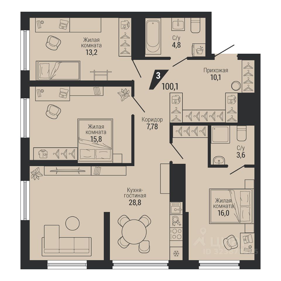 100 м² · Этаж 25 из 30