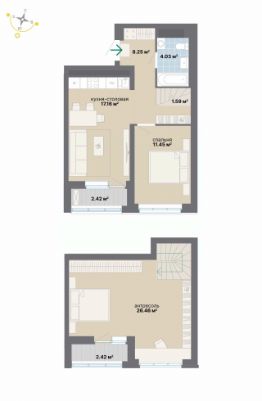 Квартира 26 в подъезде 1. Комфортные квартиры на ВИЗе в квартале, продолжающем традиции свердловского авангарда. Высота потолков до 2,7 м. На стилобате расположен просторный двор, под ним — двухуровневый подземный паркинг с лифтовым доступом. Сквозные холлы и стойка ресепшн. Большой выбор планировок, в том числе с тёплыми лоджиями и круглыми окнами. Чистовая отделка. В составе проекта — детский сад на 150 мест, рядом — реконструированная школа 41.