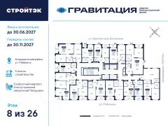 Удачные решенияНовый квартал благоустроенной жизни ''Гравитация'' мы разместили в периметре улиц Рябинина и Академика Ландау. У квартала 5 этапов строительства, а всю работу мы завершим к 2030 году.Авторы проекта гармонично совместили в оформлении природные элементы и современный дизайн. Волнообразные очертания на стенах вдохновлены силой ветра и движением воды. Скруглённые углы подчеркивают элегантный силуэт, а контрастная палитра акцентов и контурная подсветка верхних этажей создают выразительный архитектурный образ.Первый этап строительства:— Секция 1.1 — 1 подъезд 26 этажей— Секция 1.2 — 2 подъезда 16 этажей— Секция 1.3 — 1 подъезд 12 этажейЗдесь всё и сразуГравитация — уютный и обособленный, и в то же время открытый и просторный квартал. Всё рядом: супермаркеты и парки, кино и рестораны, школы и сады. В нескольких шагах набережная реки Патрушихи.В квартале построят муниципальный детский сад на 200 мест, а на 5 этапе строительства мы возведём 6-уровневый надземный паркинг на 250 машин. На первых этажах домов для вас будет работать торговая галерея с магазинами, кафе и привычными бытовыми сервисами.В 1 этапе строительства 631 квартира.Своя вселеннаяРазвитый Академический район удобен и молодым семьям, и школьникам, и состоявшимся профессионалам. Рядом большой Преображенский парк с озером и Юго-Западный лесопарк с Тропой здоровья.— 3 минуты до Гипер Ленты— 10 минут на машине до ТРЦ ''Академический'', 15 минут до ЕКАД, 25 до центра— 6 школ и 6 детских садов— Спортивные комплексы и клубы Wake up, Bright Fit и ЮностьБогатые возможностиВ квартале два просторных закрытых двора общей площадью 1,4 гектара. Один двор объединяет 1 и 2 этапы строительства, другой — 3, 4 и 5 этапы. Между дворами — камерная прогулочная аллея для неспешных вечеров или полуденного отдыха.Во дворе первого этапа — зелёные участки из хвойных деревьев, акцентных кустарников и травянистых многолетников, а также сеть дорожек, детская площадка с песочницей, аттракционами и геопластикой, настольный теннис и зона для зарядки.А для комфорта и безопасности — вечернее освещение, охрана и постоянное видеонаблюдение.Пространство с заботойВ просторных светлых лобби Гравитации — интеллигентный дизайн, помещения для колясок, высокие витражи и комфортная мебель. Выходы сквозные, на улицу и во двор. Лифты грузоподъёмностью 1000 и 450 кг.Мы подготовили для вас 44 уникальных варианта продуманных планировок, в том числе с кухнями-гостиными, гардеробными и мастер-спальнями. Здесь нет бесполезных зон, зато есть где посидеть в семейном кругу и разместить всё для удобства и комфорта.Современные технологииМы позаботились о достойной чистовой отделке, чтобы вы могли уделить время главному.— Виниловые обои на флизелиновой основе, окрашенные стены в санузлах и на лоджиях— Натяжные потолки везде, кроме лоджий, там — окрашенные— Прочный влагостойкий ламинат и керамическая плитка— Межкомнатные двери светлых тонов и сейф-дверь на входе— Эргономичное размещение розеток и выключателей