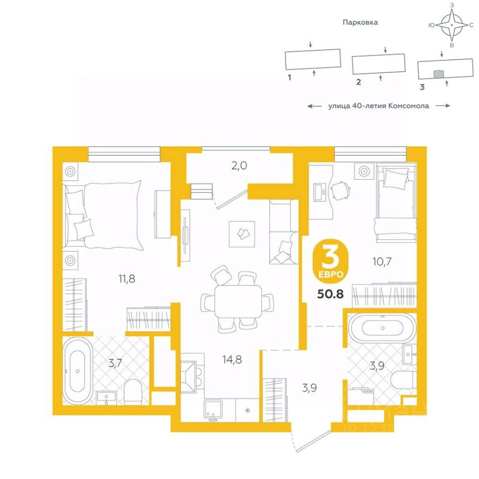 Евроформат объединяет кухню и гостиную в одно просторное помещение, что создает ощущение свободы и открытости пространства. Такая планировка предлагает гибкость в оформлении интерьера, позволяя обустроить зону в соответствии с личными предпочтениями, будь то уютный уголок для чтения или стильная обеденная зона. Идеально для тех, кто стремится к гармонии практичности и эстетики в своем доме. Квартира располагается в ЖК ''Комсомольский'' — жилом комплексе комфорт-класса. Здесь вы будете наслаждаться беззаботной жизнью, ведь ваш дом — воплощение практичности, безопасности и надежности. Для удобства предусмотрены колясочные на первых этажах домов, где можно оставить велосипеды и коляски в тепле. За безопасность отвечают система электронных ключей и видеонаблюдение. Еще здесь собственная котельная, поэтому в доме всегда будут горячая вода и оплата счетов только за фактически потребленное тепло. ПРЕИМУЩЕСТВА ЖК На этаже 14 квартир Красивые и функциональные парадные с мягкой и стильной зоной для отдыха, книгообменником, встроенными почтовыми ящиками и нишами для сумок Колясочные с доступом по ключу IP-домофоны Тихие лифты с плавным ходом О ПРОЕКТЕ ЖК ''Комсомольский'' строится в спокойном Кировском районе Екатеринбурга в границах улиц Сыромолотова — Рассветная — 40-лет Комсомола. Комплекс состоит из трех домов переменной этажности, которые выделяются динамичными линиями, выразительными фасадами и стильными лоджиями. ЛОКАЦИЯ Всё, что необходимо для повседневной жизни, находится недалеко от дома: школы, детские сады, продуктовые магазины, фитнес-клубы. Дорога до центра города на машине займет всего 10 минут — достаточно повернуть с улицы 40-летия Комсомола на улицу Владимира Высоцкого. Рядом с этим перекрестком начинается ''Тропа здоровья'' — большой терренкур вдоль ''Каменных палаток''. 10 мин до центра 3-4 минуты до школы No 82, гимназии No 176 4-5 минут до детских садов No 208, No 583, 266 20 мин до Свердловского областного медицинского колледжа и Центральной городской больницы No 7 В рамках стратегического развития района на первых этажах домов появятся коммерческие помещения, в которых откроются магазины и кафе. Следует учесть, что к 2030 году в Кировском районе планируется формирование регионального рекреационно-оздоровительного кластера, строительство ветки метро, расширение и модернизация старых промышленных зон социальной и бизнес-инфраструктуры, что приведет к созданию комфортной среды для жизни. Кроме того, в стратегию входит развитие Шарташского лесного парка как центра регионального и международного туризма. СПОСОБЫ ПОКУПКИ Ипотека: подберем выгодные условия в нескольких банках, чтобы вы могли выбрать лучшее Материнской капитал: можно использовать в качестве первоначального взноса Рассрочка: платите частями без % Сертификаты: позволяют оплатить часть стоимости квартиры О КОМПАНИИ ''Паритет Девелопмент'' — это современный и ответственный подход к реализации проектов в сфере жилищного строительства. Компания формирует среду