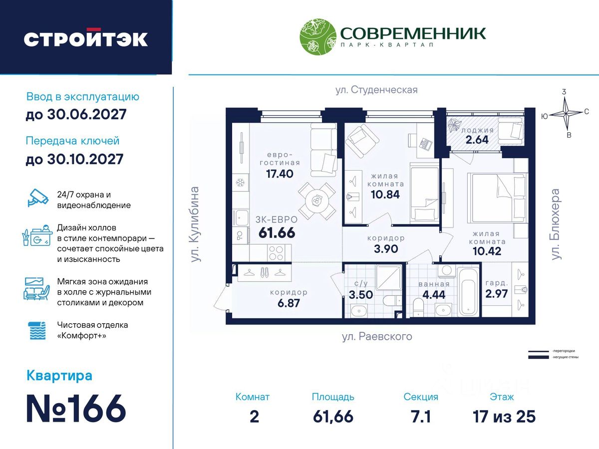 Время жить счастливо Современник — знаковый парк-квартал в интеллигентном районе Втузгородок, откуда недалеко до центра, а вблизи ведущие вузы и театры. Квартал состоит из 8 очередей строительства. Шесть очередей уже сданы и заселены, седьмая строится. В продаже квартиры от застройщика: 1 этап седьмой очереди. Объединяет квартал большой внутренний парк площадью в гектар — богатый прогулочными маршрутами, тенистыми деревьями, пространствами для отдыха, спорта и детских игр. С внешней стороны, у домов седьмой очереди, появится гостевой центр. Проект создавали в KCAP Architects and Planners, архитектурном бюро из Нидерландов, чьи работы украшают ландшафты Гамбурга, Антверпена и других городов Европы. Технологии, продуманное пространство и трендовый облик зданий создают размеренную атмосферу для жизни здесь. Достойное окружение До проспекта Ленина на машине вы доберётесь за 10 минут, а с другой стороны, неподалёку — Шарташский лесопарк с озером Шарташ, которому около миллиона лет. Здесь для вас пляжи, лодочные станции, тропы для бега и кафе. В квартале уже работают супермаркеты, пекарни, салон красоты и не только. Ближние школы, гимназии и университеты помогут расправить крылья новым поколениям, а детские сады станут заботливой средой в начале пути. Кстати, на территории квартала спроектирован муниципальный детский сад на 200 мест. Выходите во двор Гуляйте по зелёным аллеям или устройтесь с книгой в гамаке. Займитесь воркаутом, футболом, баскетболом или пинг-понгом. Проводите семейные праздники под крытым амфитеатром или отправьте детей играть на насыщенный плейхаб. Мы всё предусмотрели. На закрытой территории без машин и посторонних спокойно и безопасно. Видеонаблюдение и освещение добавляют ещё больше уверенности. Впечатляющая доминанта у домов 7 очереди — новый гостевой центр: камерное пространство под навесом-перголой с озеленением и скамейками, чтобы встречать друзей. Ваша зона комфорта Стильное лобби Современника мы выполним в эстетике contemporary: минимализм, сочетание дерева со штукатуркой и тёмным металлом, зеркала, витражи. Обстановка из мягкой мебели, растений и книг. Двери из холла выходят на обе стороны. Внутри — комната для колясок и самокатов. На -1 этаже подземный паркинг с 201 машино-местом, куда легко попасть на лифте прямо с вашего этажа. Здесь же можно приобрести одну из 67 кладовых, чтобы хранить сезонный инвентарь. СТРОЙТЭК возводит 7 очередь в 3 этапа. Дом с привилегиями Первый этап — секция 7.1, башня в 25 этажей. Здесь 246 квартир в 19 уникальных планировках от студий до 3-комнатных, в классических и евро-вариантах. Просторные кухни-гостиные, гардеробные и окна на 2 стороны — лишь часть их плюсов. В Современнике улучшенный стандарт отделки ''Комфорт +''. Помимо комфортных сантехники и электрики, в него входят оконные стёкла Energy Light, которые помогают сохранять температуру, прочный ламинат 33 класса и устойчивые к многократной покраске виниловые обои. Белые межкомнатные двери и плинтусы подчеркнут любую цветовую гамму.
