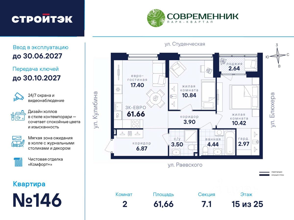 Жилой комплекс ''Современник-6 дом'' (секция 6.1) ''Современник'' — жилой квартал из 8 очередей строительства, расположенный на пересечении улиц Блюхера, Раевского, Комвузовской и Студенческой. Шестая очередь строительства включает 2 отдельных дома в глубине квартала. Дома сданы. Продажа квартир осуществляется по договору купли-продажи от застройщика. Сердце комплекса — ландшафтный парк площадью 1 гектар, оборудованный прогулочными маршрутами и детскими площадками. В 10 минутах на машине проспект Ленина, в пешей доступности — Шарташский лесопарк. Здесь вы можете приобрести машино-места в подземном паркинге и келлеры — кладовые комнаты. Кроме того, чистовая отделка в квартирах этой очереди выполнена по улучшенному стандарту ''Комфорт +'' с применением более функциональных и престижных материалов и решений. Район Кировский район — вблизи от динамичного центра, при этом в ''Современнике'' — своя атмосфера уюта и комфорта. Рядом с домом — лесопарк с озером Шарташ. Вблизи 5 школ, 3 детских сада и 3 вуза В пешей доступности Центр футбольной подготовки, фитнес-клубы и спортивный комбинат ''Урал'' ''Пятёрочка'', ''Магнит'' и ''Перекрёсток'' — в нескольких минутах ходьбы До торговых центров ''Современник'', ''Апельсин'' и ''Парк Хаус'' — 5-10 минут на машине Неподалёку — Дендрологический и Основинский парки, а также парк имени Блюхера Двор В ландшафтном парке кроме детских площадок вас ждут спортплощадки для футбола и стритбола, воркаут-комплекс и даже крытый деревянный амфитеатр для праздников или отдыха в жаркую погоду. Но это не всё. Закрытая территория с охраной Двор без машин, можно заехать только для погрузки-разгрузки Круглосуточное видеонаблюдение Подземный паркинг с машиноместами разной площади и доступом на лифте из подъезда Освещение всей территории парка-квартала Подъезд Доступ в подъезд на уровне земли — без барьеров Домофоны — в тёплых остеклённых тамбурах Удобная система навигации Помещения для колясок и самокатов на 1 этаже Сквозной вход — с внешней стороны улицы и со двора Планировки Объединённые кухни-гостиные для простора 3D-модели с вариантами обстановки Отказ от бесполезных ''мёртвых'' зон Отделка Улучшенный стандарт отделки ''Комфорт +'' На полу в комнатах, прихожих и кухнях ламинат 33 класса повышенной прочности, в ванной и туалете - плитка, на стенах виниловые обои на флизелиновой основе, потолки в комнатах, лоджиях и кухнях окрашенные, в коридорах, прихожих и санузлах натяжные Двухкамерные стеклопакеты с приточными клапанами вентиляции и детскими замками Оконные стёкла Energy light с покрытием из соединений серебра — минимум тепловых потерь, защита от вредного излучения и лучшая освещённость Межкомнатные двери и плинтусы белого цвета, усиленная сейф-дверь на входе в квартиру В санузлах установлены раковины и унитазы, а во всей квартире — розетки и выключатели Радиаторы с терморегуляторами и горизонтальной разводкой Приборы учета электроэнергии, отопления и водоснабжения
