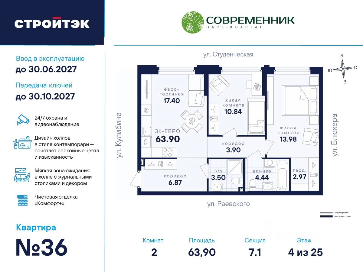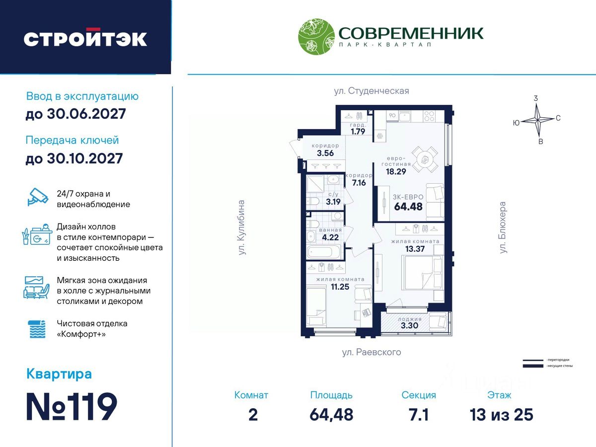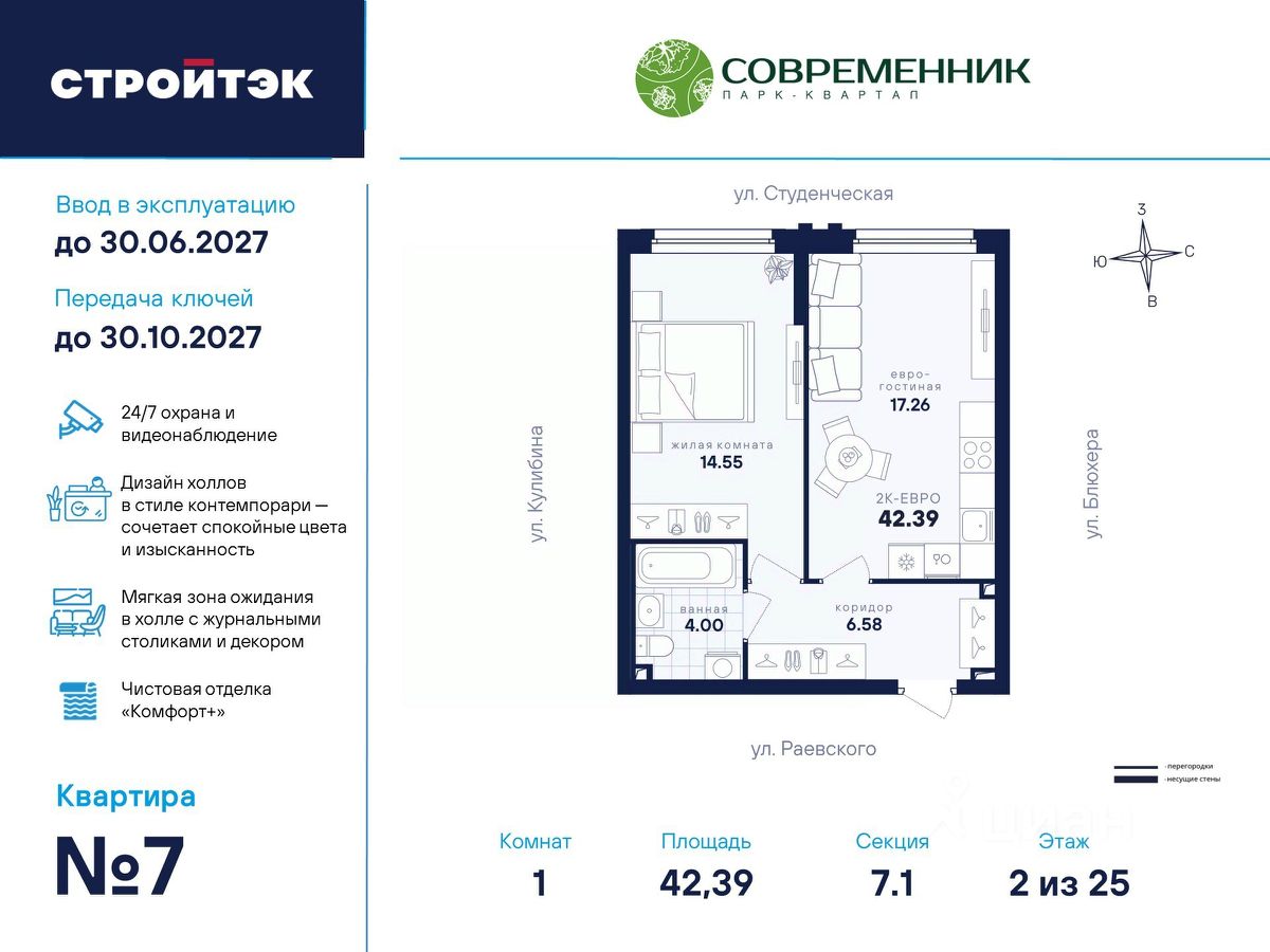 Время жить счастливо Современник — знаковый парк-квартал в интеллигентном районе Втузгородок, откуда недалеко до центра, а вблизи ведущие вузы и театры. Квартал состоит из 8 очередей строительства. Шесть очередей уже сданы и заселены, седьмая строится. В продаже квартиры от застройщика: 1 этап седьмой очереди. Объединяет квартал большой внутренний парк площадью в гектар — богатый прогулочными маршрутами, тенистыми деревьями, пространствами для отдыха, спорта и детских игр. С внешней стороны, у домов седьмой очереди, появится гостевой центр. Проект создавали в KCAP Architects and Planners, архитектурном бюро из Нидерландов, чьи работы украшают ландшафты Гамбурга, Антверпена и других городов Европы. Технологии, продуманное пространство и трендовый облик зданий создают размеренную атмосферу для жизни здесь. Достойное окружение До проспекта Ленина на машине вы доберётесь за 10 минут, а с другой стороны, неподалёку — Шарташский лесопарк с озером Шарташ, которому около миллиона лет. Здесь для вас пляжи, лодочные станции, тропы для бега и кафе. В квартале уже работают супермаркеты, пекарни, салон красоты и не только. Ближние школы, гимназии и университеты помогут расправить крылья новым поколениям, а детские сады станут заботливой средой в начале пути. Кстати, на территории квартала спроектирован муниципальный детский сад на 200 мест. Выходите во двор Гуляйте по зелёным аллеям или устройтесь с книгой в гамаке. Займитесь воркаутом, футболом, баскетболом или пинг-понгом. Проводите семейные праздники под крытым амфитеатром или отправьте детей играть на насыщенный плейхаб. Мы всё предусмотрели. На закрытой территории без машин и посторонних спокойно и безопасно. Видеонаблюдение и освещение добавляют ещё больше уверенности. Впечатляющая доминанта у домов 7 очереди — новый гостевой центр: камерное пространство под навесом-перголой с озеленением и скамейками, чтобы встречать друзей. Ваша зона комфорта Стильное лобби Современника мы выполним в эстетике contemporary: минимализм, сочетание дерева со штукатуркой и тёмным металлом, зеркала, витражи. Обстановка из мягкой мебели, растений и книг. Двери из холла выходят на обе стороны. Внутри — комната для колясок и самокатов. На -1 этаже подземный паркинг с 201 машино-местом, куда легко попасть на лифте прямо с вашего этажа. Здесь же можно приобрести одну из 67 кладовых, чтобы хранить сезонный инвентарь. СТРОЙТЭК возводит 7 очередь в 3 этапа. Дом с привилегиями Первый этап — секция 7.1, башня в 25 этажей. Здесь 246 квартир в 19 уникальных планировках от студий до 3-комнатных, в классических и евро-вариантах. Просторные кухни-гостиные, гардеробные и окна на 2 стороны — лишь часть их плюсов. В Современнике улучшенный стандарт отделки ''Комфорт +''. Помимо комфортных сантехники и электрики, в него входят оконные стёкла Energy Light, которые помогают сохранять температуру, прочный ламинат 33 класса и устойчивые к многократной покраске виниловые обои. Белые межкомнатные двери и плинтусы подчеркнут любую цветовую гамму.