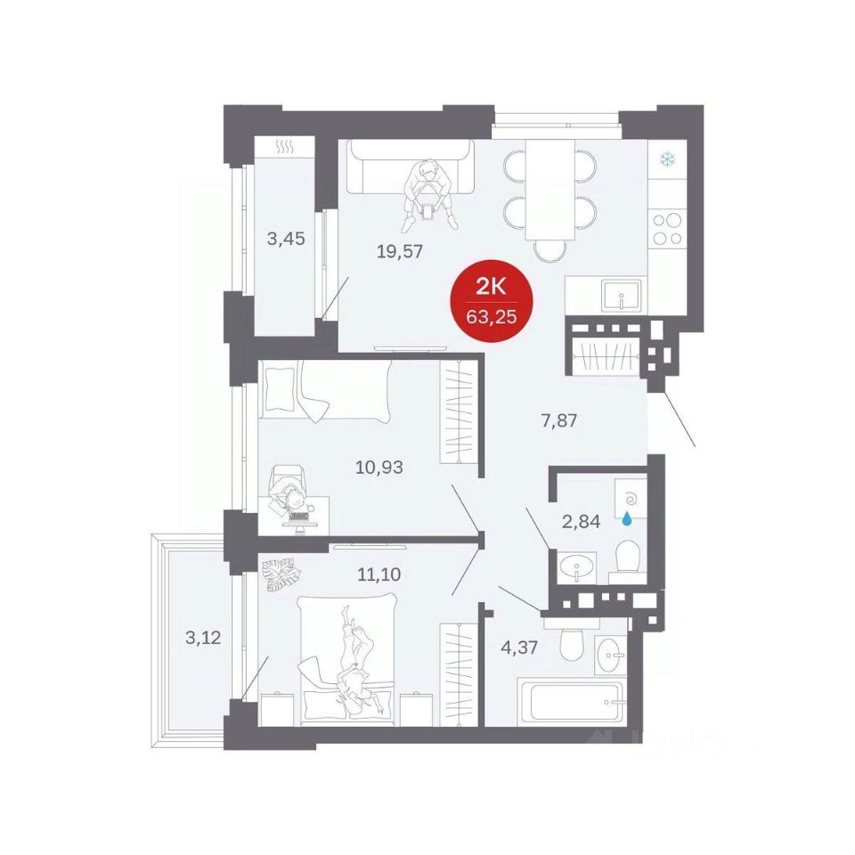 Продаётся 2-комнатная квартира в строящемся доме (Секции 1-4), срок сдачи: II-кв. 2027, общей площадью 63.25 кв.м., на 3 этаже. Новый жилой комплекс ''Сибирская калина'' от застройщика ''СЗ Атлант-Екатеринбург'' расположен по адресу: г. Екатеринбург, улица Титова.