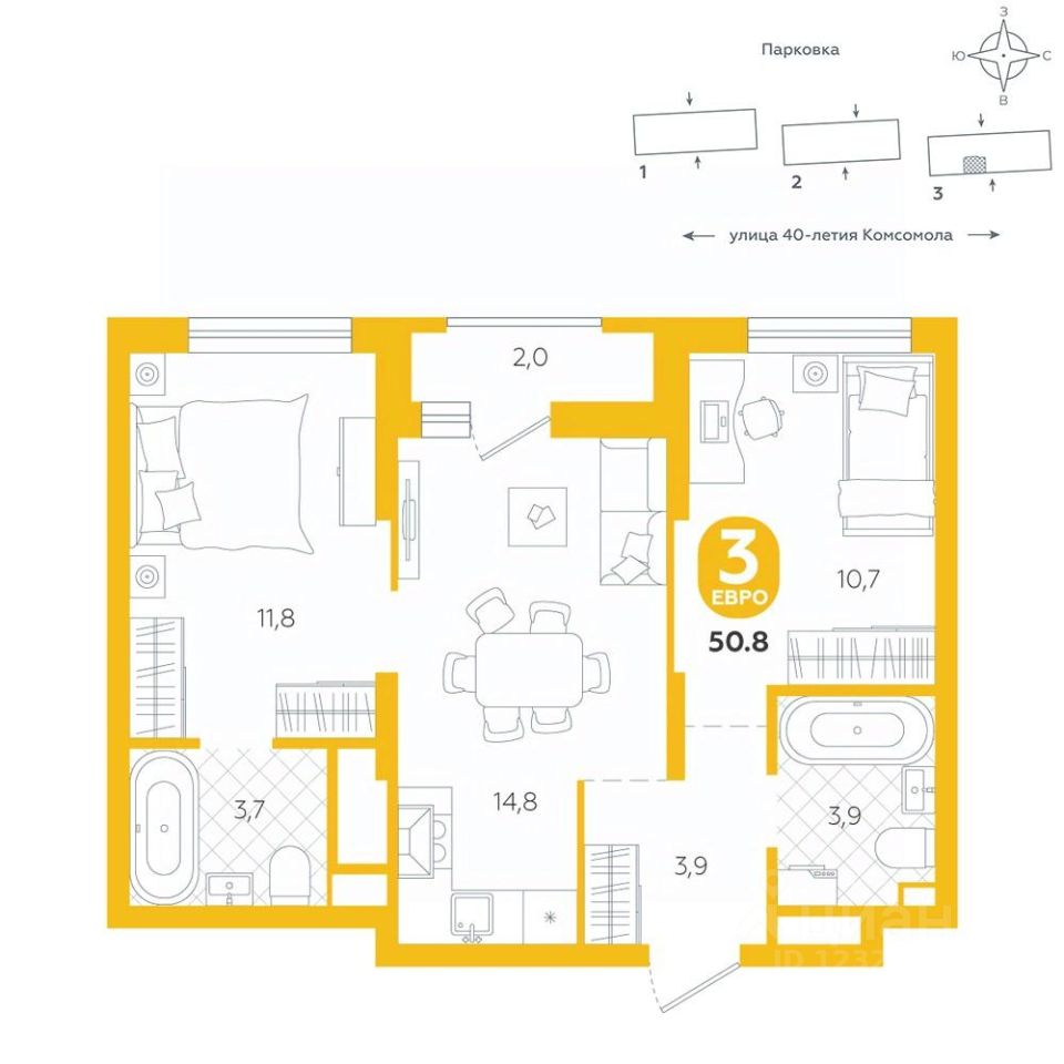Евроформат объединяет кухню и гостиную в одно просторное помещение, что создает ощущение свободы и открытости пространства. Такая планировка предлагает гибкость в оформлении интерьера, позволяя обустроить зону в соответствии с личными предпочтениями, будь то уютный уголок для чтения или стильная обеденная зона. Идеально для тех, кто стремится к гармонии практичности и эстетики в своем доме. Квартира располагается в ЖК ''Комсомольский'' — жилом комплексе комфорт-класса. Здесь вы будете наслаждаться беззаботной жизнью, ведь ваш дом — воплощение практичности, безопасности и надежности. Для удобства предусмотрены колясочные на первых этажах домов, где можно оставить велосипеды и коляски в тепле. За безопасность отвечают система электронных ключей и видеонаблюдение. Еще здесь собственная котельная, поэтому в доме всегда будут горячая вода и оплата счетов только за фактически потребленное тепло. ПРЕИМУЩЕСТВА ЖК На этаже 12 квартир Красивые и функциональные парадные с мягкой и стильной зоной для отдыха, книгообменником, встроенными почтовыми ящиками и нишами для сумок Колясочные с доступом по ключу IP-домофоны Тихие лифты с плавным ходом О ПРОЕКТЕ ЖК ''Комсомольский'' строится в спокойном Кировском районе Екатеринбурга в границах улиц Сыромолотова — Рассветная — 40-лет Комсомола. Комплекс состоит из трех домов переменной этажности, которые выделяются динамичными линиями, выразительными фасадами и стильными лоджиями. ЛОКАЦИЯ Всё, что необходимо для повседневной жизни, находится недалеко от дома: школы, детские сады, продуктовые магазины, фитнес-клубы. Дорога до центра города на машине займет всего 10 минут — достаточно повернуть с улицы 40-летия Комсомола на улицу Владимира Высоцкого. Рядом с этим перекрестком начинается ''Тропа здоровья'' — большой терренкур вдоль ''Каменных палаток''. 10 мин до центра 3-4 минуты до школы No 82, гимназии No 176 4-5 минут до детских садов No 208, No 583, 266 20 мин до Свердловского областного медицинского колледжа и Центральной городской больницы No 7 В рамках стратегического развития района на первых этажах домов появятся коммерческие помещения, в которых откроются магазины и кафе. Следует учесть, что к 2030 году в Кировском районе планируется формирование регионального рекреационно-оздоровительного кластера, строительство ветки метро, расширение и модернизация старых промышленных зон социальной и бизнес-инфраструктуры, что приведет к созданию комфортной среды для жизни. Кроме того, в стратегию входит развитие Шарташского лесного парка как центра регионального и международного туризма. СПОСОБЫ ПОКУПКИ Ипотека: подберем выгодные условия в нескольких банках, чтобы вы могли выбрать лучшее Материнской капитал: можно использовать в качестве первоначального взноса Рассрочка: платите частями без % Сертификаты: позволяют оплатить часть стоимости квартиры О КОМПАНИИ ''Паритет Девелопмент'' — это современный и ответственный подход к реализации проектов в сфере жилищного строительства. Компания формирует среду