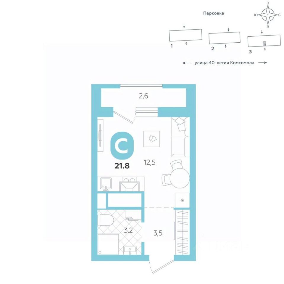 Эргономичная квартира-студия с лоджией и перспективой роста в цене — отличный выбор для тех, кто делает первые шаги к самостоятельной жизни. Общая площадь квартиры 21,6 кв.м., и ее умная планировка позволяет создать атмосферу, полностью отражающую ваши стиль и предпочтения. Квартира располагается в ЖК ''Комсомольский'' — жилом комплексе комфорт-класса. Здесь вы будете наслаждаться беззаботной жизнью, ведь ваш дом — воплощение практичности, безопасности и надежности. Для удобства предусмотрены колясочные на первых этажах домов, где можно оставить велосипеды и коляски в тепле. За безопасность отвечают система электронных ключей и видеонаблюдение. Еще здесь собственная котельная, поэтому в доме всегда будут горячая вода и оплата счетов только за фактически потребленное тепло. ПРЕИМУЩЕСТВА ЖК На этаже 14 квартир Красивые и функциональные парадные с мягкой и стильной зоной для отдыха, книгообменником, встроенными почтовыми ящиками и нишами для сумок Колясочные с доступом по ключу IP-домофоны Тихие лифты с плавным ходом О ПРОЕКТЕ ЖК ''Комсомольский'' строится в спокойном Кировском районе Екатеринбурга в границах улиц Сыромолотова — Рассветная — 40-лет Комсомола. Комплекс состоит из трех домов переменной этажности, которые выделяются динамичными линиями, выразительными фасадами и стильными лоджиями. ЛОКАЦИЯ Всё, что необходимо для повседневной жизни, находится недалеко от дома: школы, детские сады, продуктовые магазины, фитнес-клубы. Дорога до центра города на машине займет всего 10 минут — достаточно повернуть с улицы 40-летия Комсомола на улицу Владимира Высоцкого. Рядом с этим перекрестком начинается ''Тропа здоровья'' — большой терренкур вдоль ''Каменных палаток''. 10 мин до центра 3-4 минуты до школы No 82, гимназии No 176 4-5 минут до детских садов No 208, No 583, 266 20 мин до Свердловского областного медицинского колледжа и Центральной городской больницы No 7 В рамках стратегического развития района на первых этажах домов появятся коммерческие помещения, в которых откроются магазины и кафе. Следует учесть, что к 2030 году в Кировском районе планируется формирование регионального рекреационно-оздоровительного кластера, строительство ветки метро, расширение и модернизация старых промышленных зон социальной и бизнес-инфраструктуры, что приведет к созданию комфортной среды для жизни. Кроме того, в стратегию входит развитие Шарташского лесного парка как центра регионального и международного туризма. СПОСОБЫ ПОКУПКИ Ипотека: подберем выгодные условия в нескольких банках, чтобы вы могли выбрать лучшее Материнской капитал: можно использовать в качестве первоначального взноса Рассрочка: платите частями без % Сертификаты: позволяют оплатить часть стоимости квартиры О КОМПАНИИ ''Паритет Девелопмент'' — это современный и ответственный подход к реализации проектов в сфере жилищного строительства. Компания формирует среду, способную создать новое качество жизни для клиентов, поэтому каждый проект имеет свою философию — не просто квадр