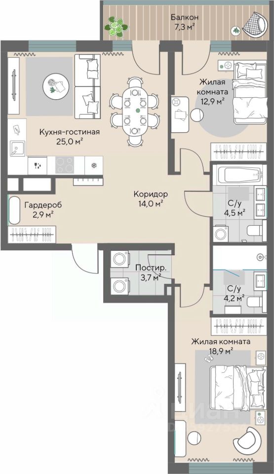 Продам квартиру в ЖК бизнес-класса Нагорный. Две изолированные спальни и просторная кухня-гостиная.4 квартиры на этаже. Ключи получены. Нашему покупателю доступно машиноместо в отапливаемом подземном паркинге по лучшим условиям и кладовая. Если вас заинтересовало это предложение, звоните, отправлю видео, материалы по ЖК и отделке white box, схему дома и паркинга. Дом состоит из двух секций, высотой 15 этажей, удачно расположен во дворе комплекса, без шумных дорог и ветров. Редкая планировка правильной формы. Угловое остекление кухни-гостиной. Стороны света на запад и на север. Один совершеннолетний собственник, покупали за наличные осенью 2023 года, полная стоимость в договоре. Аналоги у застройщика с передачей ключей летом 2027 года. Код пользователя: 107218 Номер в базе: 9517847