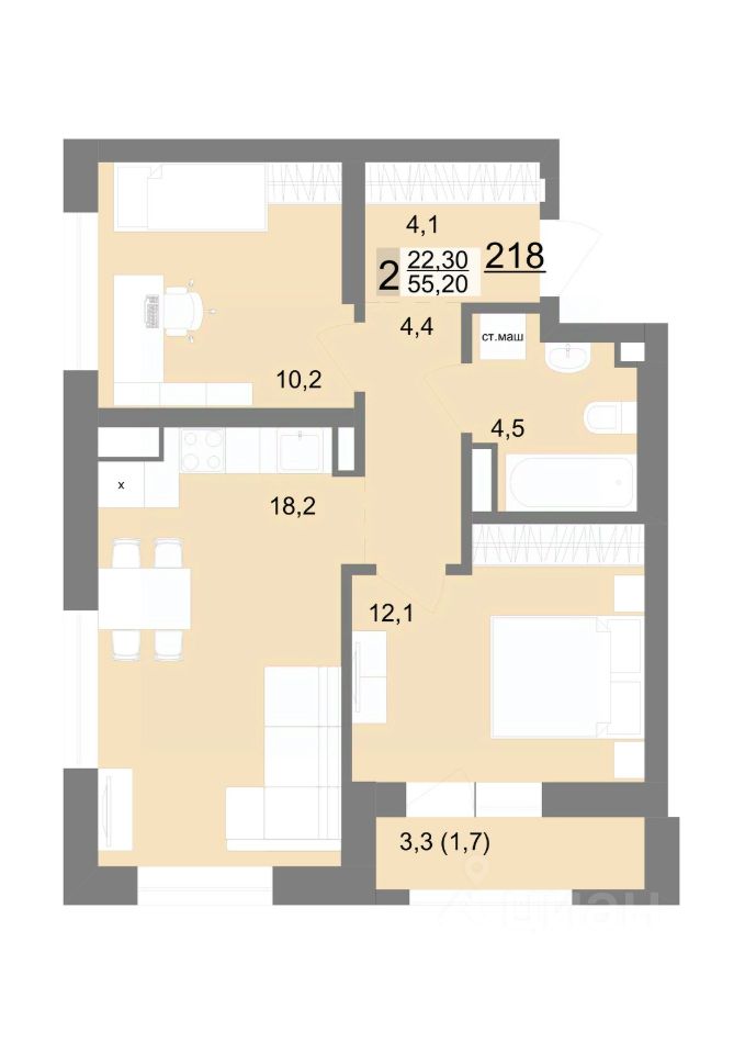 55 м² · Этаж 18 из 26