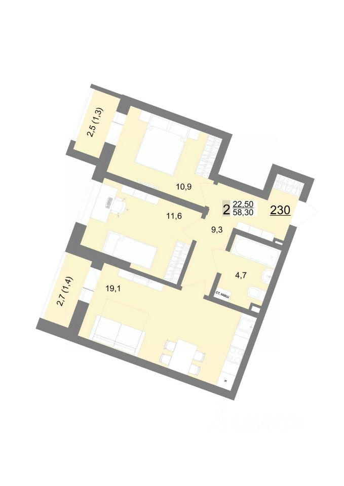 58 м² · Этаж 2 из 26