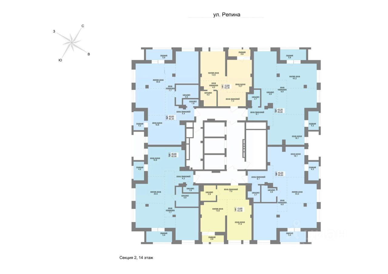 86 м² · Этаж 14 из 30