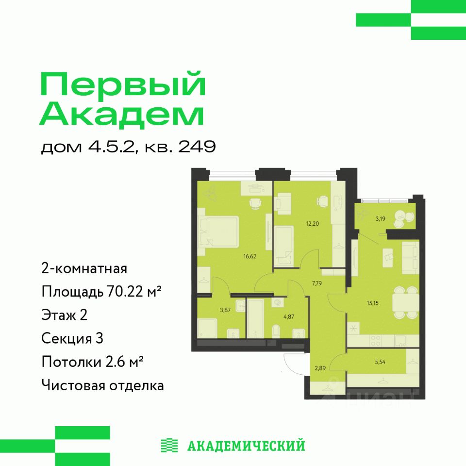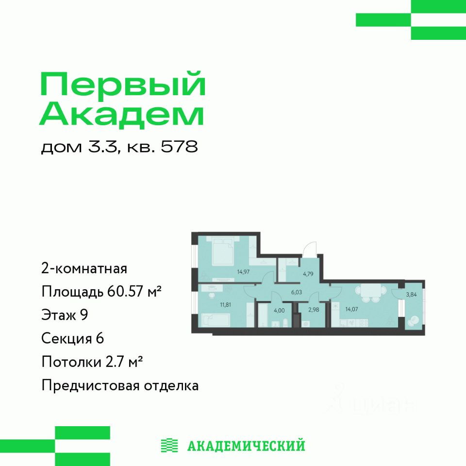 Продается 2-комнатная квартира площадью 60.57 кв.м. от девелопера ''Академический'' в жилом квартале ''Первый Академ''. Срок сдачи дома в 2028 году. Выгоды и скидка напрямую от застройщика. Дом расположен на въезде в район, отличается удобной транспортной развязкой. Рядом новая трамвайная линия и остановка общественного транспорта. На территории квартала предусмотрено множество удобств для жильцов, включая видеонаблюдение 24/7, двор без машин, кладовые и подземный паркинг с выходом из лифта, коммерция на первых этажах.