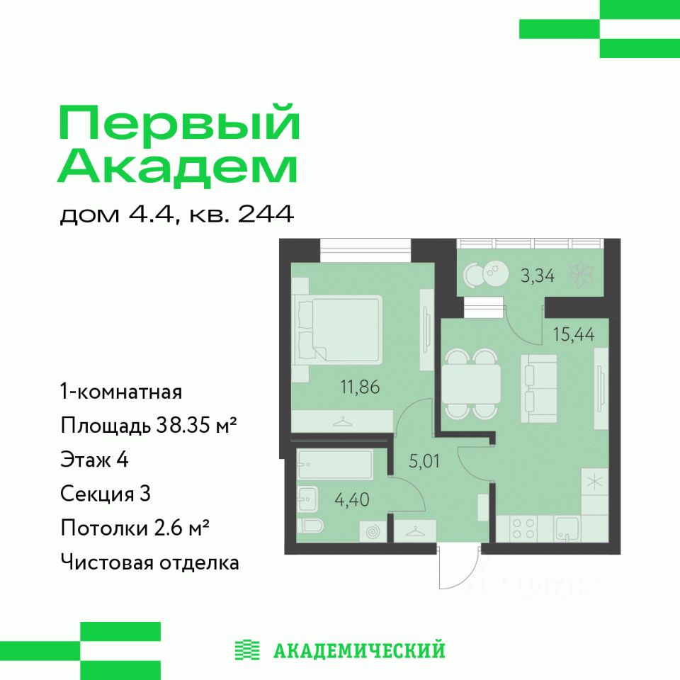 Продается 1-комнатная квартира площадью 34.14 кв.м. от девелопера ''Академический'' в жилом квартале ''Первый Академ''. Срок сдачи дома в 2028 году. Выгоды и скидка напрямую от застройщика. Дом расположен на въезде в район, отличается удобной транспортной развязкой. Рядом новая трамвайная линия и остановка общественного транспорта. На территории квартала предусмотрено множество удобств для жильцов, включая видеонаблюдение 24/7, двор без машин, кладовые и подземный паркинг с выходом из лифта, коммерция на первых этажах.