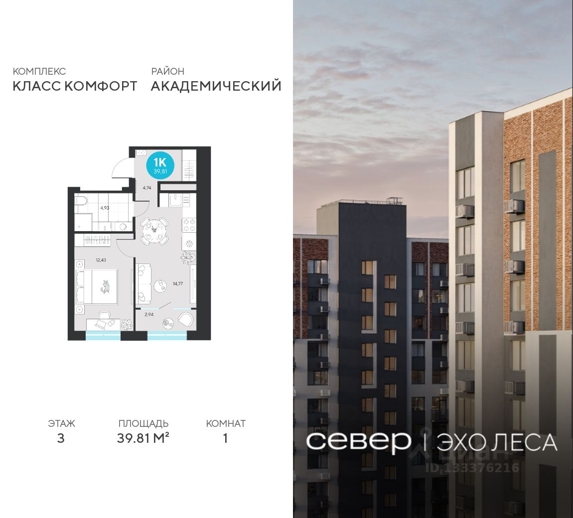 Продаётся квартира площадью 39.81 м2 в жилом комплексе ''Эхо леса''. Квартира находится на 3 этаже, жилая площадь квартиры 12.43 м2, площадь просторной кухни — 14.77 м2. Среди особенностей планировки — изолированные комнаты с окнами на одну сторону, 1 совмещённый санузел. Срок сдачи — I кв. 2028 Жилой комплекс ''Эхо леса'' — это: - дом в эко-стиле - двор с выходом в лесопарк - лаконичная архитектура - развитая инфраструктура вокруг квартала Инфраструктура В окружении проекта — вся необходимая инфраструктура: детские сады, школы, спортивный комплекс, продуктовые магазины, аптеки, кофейни, рестораны и салоны красоты. Благоустройство Концепция двора-парка продолжает тему леса. Ландшафт с продуманным всесезонным озеленением дополняют акценты: сухой ручей из камней, столы и навесы из натурального дерева, эко-тропы, фонтан и променад. Для взрослых предусмотрены пешеходные и велодорожки, для детей — игровые площадки для разных возрастов. Архитектура Переменная высота секций создаёт выразительный архитектурный облик. На фасадах — игра контрастных, при этом природных оттенков. Динамики зданию придают текстуры материалов: фактурной штукатурки и клинкерного кирпича. Лобби Интерьер в холле продолжает концепцию квартала и выполнен в эко стиле. В отделке используются элементы природных материалов с изображениями листвы и деревьев. Паркинг Тёплый подземный паркинг организован как единое пространство с собственным дизайном. Кладовые Индивидуальные помещения на техническом этаже — способ сохранить пространство в квартире. Попасть в кладовые можно на лифте. Планировки В продуманных планировках выделены тихие и шумные зоны. Приватные спальни и кабинеты спрятаны от маршрутов домашнего движения, а кухни-гостиные с барной стойкой вместо стены — всегда готовы к семейным праздникам. Из окон квартир открываются живописные виды на лес.