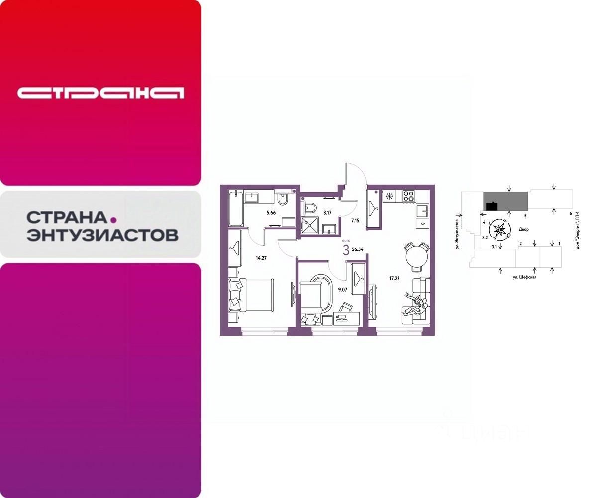 Новая квартира в ЖК ''Страна.Энтузиастов'' напрямую от федерального застройщика ''Страна Девелопмент''. Продается 3комнатная квартира на 14 этаже от застройщика Страна Девелопмент. Площадь квартиры 56,54 кв. м. ЖК ''Страна.Энтузиастов'' Жилой комплекс ''Страна.Энтузиастов'' — это уютный квартал на севере Екатеринбурга, в центре Эльмаша. Здесь органично соединяются природа и умные технологии. Главной точкой притяжения станет ''зелёная'' городская гостиная, которая объединит жителей района. А значимой социальной особенностью проекта выступит муниципальный детсад на 100 мест. Преимущества •Городская гостиная для отдыха жителей и гостей — мы вдохновились энергией народной стройки и огромным желанием сделать свой дом лучше и уютнее. Ведь в середине ХХ века на Эльмаше кипела заводская жизнь, лился металл, инженеры и рабочие. •У каждого дома свой приватный двор окружен ''зеленью'', которая будет цвести весь год. Двор мы разделили на несколько зон: для детей младшего и среднего возраста, релакс пространство с гамаками и подвесными креслами, спортивная зона с воркаут и настольным теннисом. •На первых этажах находятся торговые и офисные помещения. В них располагаются полезные сервисы для жителей: рестораны, магазины, пекарни, кофейни, аптеки, салоны красоты и пункты выдачи заказов. Для каждого помещения спроектирован отдельный вход, витражное остекление и место под вывеску. Отделка Квартиры сдаются с предчистовой отделкой: произведена разводка электричества и отопления, выполнена стяжка пола, стены выровнены ''под маяк'', установлены розетки, выключатели и радиаторы. Дизайнерская отделка При покупке квартиры в ЖК ''Страна.Энтузиастов'' можно включить стоимость ремонта в ипотеку. Пять вариантов на выбор: хлопковая нить, серый шторм, белый камень, шалфей, голубой вереск. Способы покупки Сотрудники ''Страна Девелопмент'' будут сопровождать вас на каждом этапе сделки, помогут получить одобрение по ипотеке или снизить ежемесячный платеж. - ипотека - рассрочка - с использованием материнского капитала -100% оплата наличными