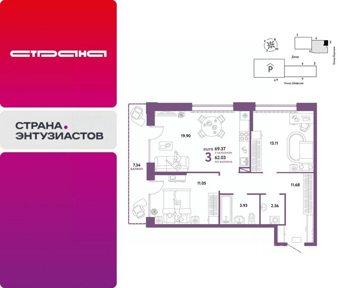 Новая квартира в ЖК ''Страна.Энтузиастов'' напрямую от федерального застройщика ''Страна Девелопмент''. Продается 3комнатная квартира на 2 этаже от застройщика Страна Девелопмент. Площадь квартиры 69,37 кв. м. ЖК ''Страна.Энтузиастов'' Жилой комплекс ''Страна.Энтузиастов'' — это уютный квартал на севере Екатеринбурга, в центре Эльмаша. Здесь органично соединяются природа и умные технологии. Главной точкой притяжения станет ''зелёная'' городская гостиная, которая объединит жителей района. А значимой социальной особенностью проекта выступит муниципальный детсад на 100 мест. Преимущества •Городская гостиная для отдыха жителей и гостей — мы вдохновились энергией народной стройки и огромным желанием сделать свой дом лучше и уютнее. Ведь в середине ХХ века на Эльмаше кипела заводская жизнь, лился металл, инженеры и рабочие. •У каждого дома свой приватный двор окружен ''зеленью'', которая будет цвести весь год. Двор мы разделили на несколько зон: для детей младшего и среднего возраста, релакс пространство с гамаками и подвесными креслами, спортивная зона с воркаут и настольным теннисом. •На первых этажах находятся торговые и офисные помещения. В них располагаются полезные сервисы для жителей: рестораны, магазины, пекарни, кофейни, аптеки, салоны красоты и пункты выдачи заказов. Для каждого помещения спроектирован отдельный вход, витражное остекление и место под вывеску. Отделка Квартиры сдаются с предчистовой отделкой: произведена разводка электричества и отопления, выполнена стяжка пола, стены выровнены ''под маяк'', установлены радиаторы. Дизайнерская отделка При покупке квартиры в ЖК ''Страна.Энтузиастов'' можно включить стоимость ремонта в ипотеку. 4 стиля отделки ванной и 5 стилей отделки комнат на выбор. Кухня от застройщика Одна из удобных опций от Страны — приобретение кухни в ипотеку при покупке опции ''Ремонт''. Доступно 4 стиля на выбор: дерево, керамика, мрамор, бетон. Умный дом Система ''Умный дом'' создаст новый уровень комфорта. Управление светом с помощью голоса, получение последней информации о ситуации в квартире во время отпуска или рабочего дня — и другие преимущества включены в пакет. Способы покупки Сотрудники ''Страна Девелопмент'' будут сопровождать вас на каждом этапе сделки, помогут получить одобрение по ипотеке или снизить ежемесячный платеж. - ипотека - рассрочка - с использованием материнского капитала -100% оплата наличными