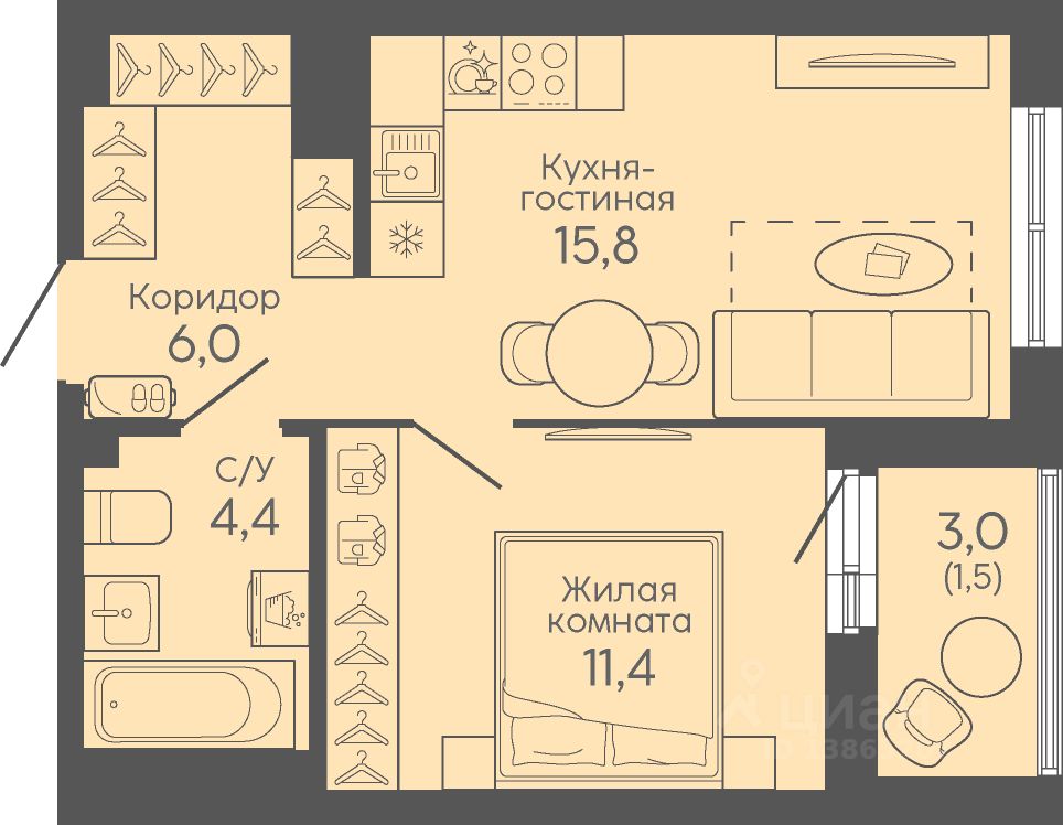 34 м² · Этаж 8 из 16