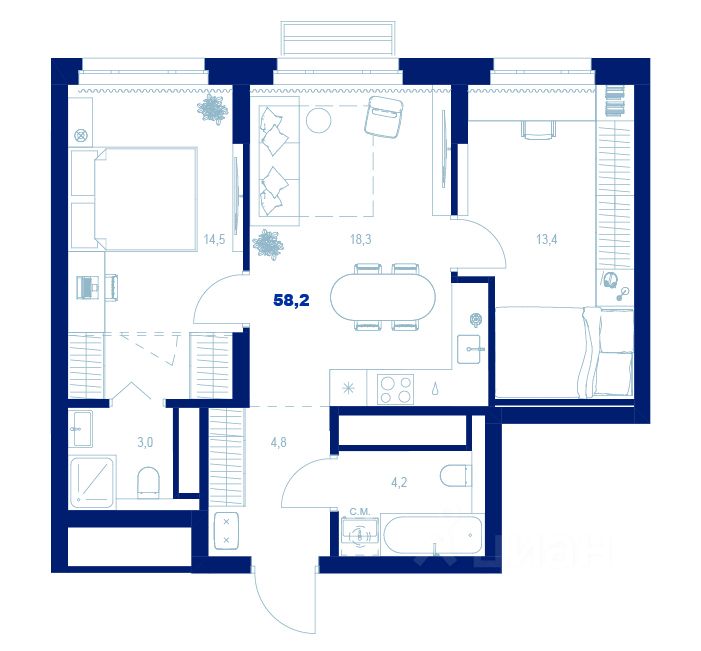 58 м² · Этаж 19 из 32