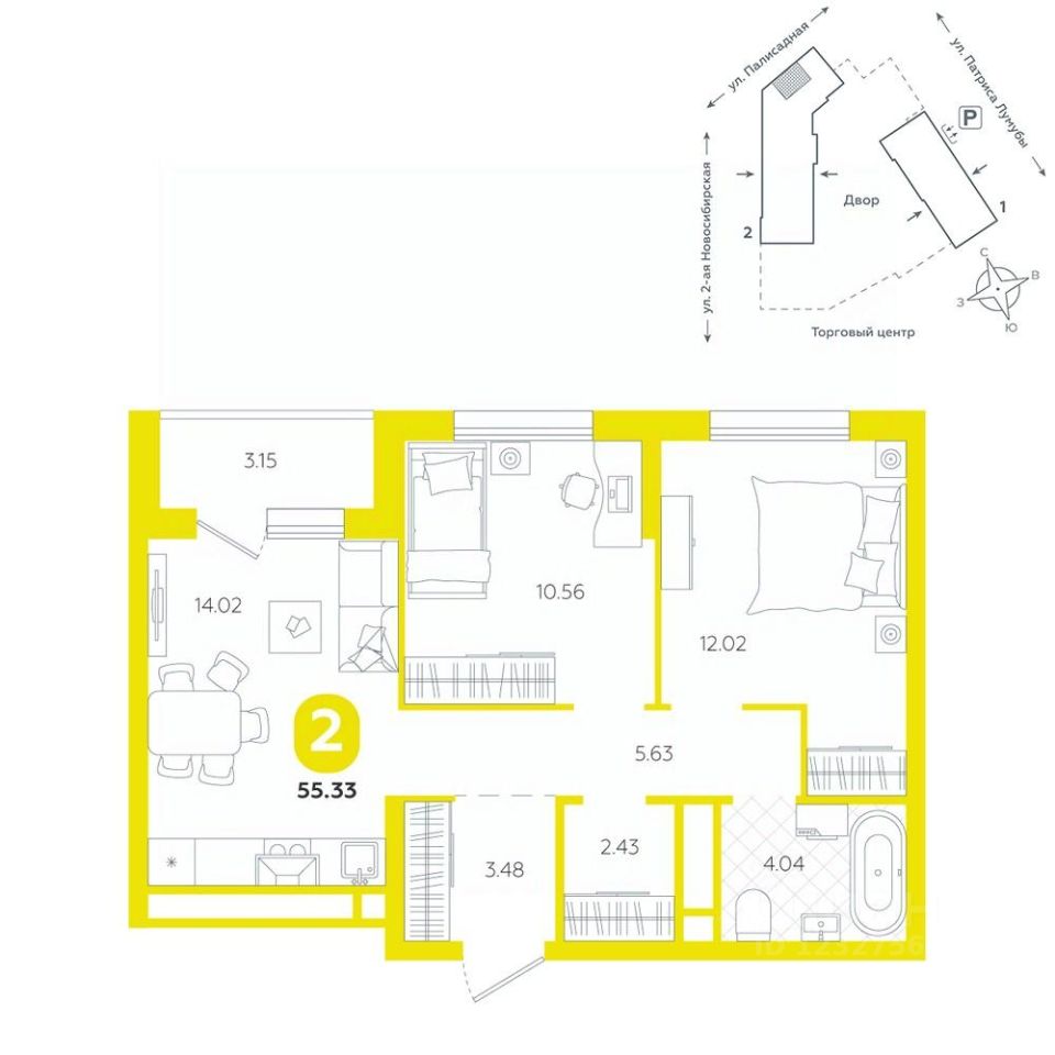 Квартира находится в ЖК ''Бодровский'' от федерального застройщика ''Паритет Девелопмент''. Это жилой комплекс комфорт-класса с современной архитектурой, расположенный в Екатеринбурге в районе улиц Патриса Лумумбы и 2-й Новосибирской. Добраться от него до центра города можно всего за 25 минут, дорога до ЕКАДа займет 12 минут. В окружении жилого комплекса есть шесть детских садов, пять школ, три больших парка, пять спорткомплексов, в том числе курортный комплекс Уктус. Квартал состоит из двух секций переменной этажности (от 14 до 24 этажей) и подземного паркинга с кладовыми, к которым можно будет спуститься на лифте. На первых этажах предусмотрены коммерческие помещения: жители смогут сделать маникюр, воспользоваться услугами ателье, выпить кофе с круассаном, не покидая своего района. Ввод в эксплуатацию в III кв. 2027 года. Территория комплекса огорожена от машин и посторонних людей. Озеленение с многолетними растениями и деревьями создает ощущение близости к природе. Двор наполнен всем необходимым: песочницы и качели для самых маленьких, интерактивная башня для детей постарше, воркаут-зона и места для отдыха. На всей территории реализована безбарьерная среда. В парадных выполнен авторский ремонт. За счет панорамного остекления и 4-метровых потолков там всегда много естественного света. Предусмотрены колясочные с местами для хранения спортинвентаря и креплениями для велосипедов. В проекте представлены студии, классические одно- и двухкомнатные варианты, а также двух-, трех- и четырехкомнатные квартиры в евроформате площадью от 25,32 до 76,65. Все планировки — функциональные и подходящие новоселам как с детьми, так и без них. Есть варианты с лоджиями, где можно организовать дополнительное пространство для отдыха, спорта или работы, а еще квартиры с мастер-спальней, гардеробной, двумя санузлами. В каждой предусмотрена вытяжная вентиляция с естественным побуждением, счетчики с телеметрией и корзины для кондиционеров. Характеристики квартиры: этаж - 4 количество комнат - 2 номер помещения - 171 площадь квартиры - 55,33 кв.м Чтобы сэкономить время и деньги, можно приобрести квартиру сразу с ремонтом от застройщика. На выбор 3 конфигурации: базовый, с кухонным гарнитуром, с кухонным гарнитуром и другой мебелью - в светлом и темном оттенках. Ремонт можно включить в ипотеку.