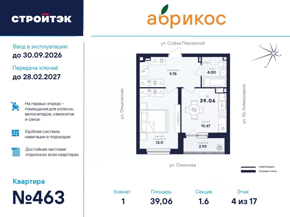ЖК ''Абрикос'' расположен в окружении улиц Софьи Перовской, Ольховской и Пехотинцев — в уютном микрорайоне Новая сортировка. Здесь безопасный двор, детские площадки и просторные подъезды. Район Тихий микрорайон Новая сортировка на Северо-западе Екатеринбурга. 7 школ и 11 детсадов поблизости 15 минут на машине до кольцевой дороги, а до центра — полчаса даже по пробкам 20 минут пешком до парка ''Таганская слобода'' 6 продуктовых магазинов рядом, а ''Верный'' — на первом этаже 10 минут на машине до ТЦ ''Карнавал'' Двор Во дворе хорошо должно быть всем: детям — площадки по возрасту, взрослым — прогулочные дорожки. Но это не всё. Концепция ''Двор без машин'', когда можно заехать только для разгрузки и погрузки Стритбольная площадка Вместительная парковка вокруг ЖК Закрытая территория с пропускной системой Круглосуточное видеонаблюдение и освещение территории Подъезды Не подъезд, а парадная. Так говорят в Петербурге, но и в ''Абрикосе'' это слово приходит в голову. Просторные холлы с ярким солнечным дизайном, витражами и достойной отделкой. Доступ в подъезды на уровне земли — без барьеров Домофоны — в тёплых остеклённых тамбурах В каждом подъезде — грузопассажирский лифт Помещения для колясок и самокатов на 1 этаже Удобная навигация с номерами этажей и квартир Планировки Наш подход к проектированию квартир называется ''Разумные метры''. Это значит не только исходить из площади, но и учитывать число жильцов и их потребности. Объединённые кухни-гостиные для простора и общения 3D-модели с вариантами обстановки В зависимости от вашего стиля жизни — по несколько вариантов планировок студий, однушек, двушек и трёшек Отказ от бесполезных ''мёртвых'' зон Отделка В каждой квартире ''Абрикоса'' мы позаботились о чистовой отделке, чтобы ваш переезд прошёл быстро и не вызвал лишних хлопот. На полу в комнатах, прихожих и кухнях — прочный водостойкий ламинат, в санузлах — керамическая плитка На стенах виниловые обои на флизелиновой основе, белые натяжные потолки везде, кроме балконов и лоджий там - окрашенные Межкомнатные двери и усиленная сейф-дверь на входе в квартиру В санузлах установлены раковины и унитазы, а во всей квартире — розетки и выключатели Радиаторы с терморегуляторами и горизонтальной разводкой, двухкамерные стеклопакеты с приточными клапанами вентиляции Телеметрические счётчики на свет, тепло и воду
