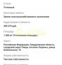 id:713. Арт. 64136012 Продается земельный участок общей площадью 15 соток земли, рядом с п. Ледянка, в 10 км. от г. Ревда по хорошей асфальтированной дороге.Кадастровый номер: 66:21:1204002:1258, 835.п. Ледянка - экологически чистый район на берегу Мариинского водохранилища. Участок выгодно расположен, вдали от проезжей части. Дорога до самого участка проездная, грунтовая.На участке есть фундамент для дома 10х13м., с учетом беседки-террасы, а также фундамент под гараж 6х7м.Имеется собственная скважина, на участок проведено и подключено электричество, счетчик опломбирован. Планируют проводить газ. Участок уже размечен, геодезиста вызывать не нужно.Участок находится в очень живописном месте. Рядом пруд. Участок не возле центральной дороги. Соседи активно строятся. Доброжелательные, общительные.Присвоен милицейский адрес, ул. Байкальская 16.Отличное место для загородного дома, дачи, а также можно использовать как инвестиционный проект по типу глемпинга, аренды и т.п.Более подробную информацию, по продаже, расположению, дополнительных фото можете узнать по телефону или при встречи.