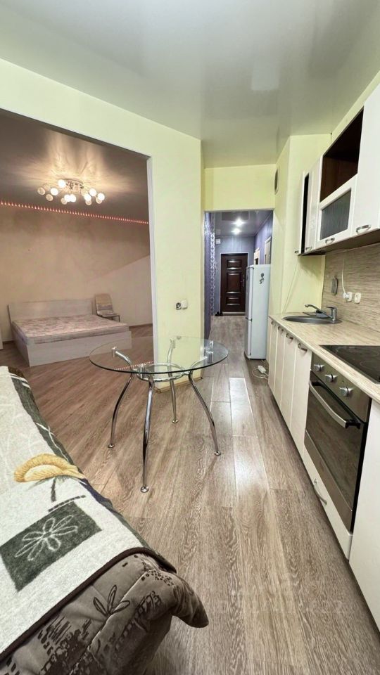Уютная студия в новом ЖК бизнес класса. Вокруг развитая инфраструктура: парки, магазины, школы, детские сады, остановки общественного транспорта. На первом этаже прекрасное лобби, в общей зоне есть детская комната. Закрытый двор. Квартира полностью укомплектована мебелью и техникой. В квартиру проведен интернет и телевидение. Рядом ТЦ Максидом с большой парковкой.