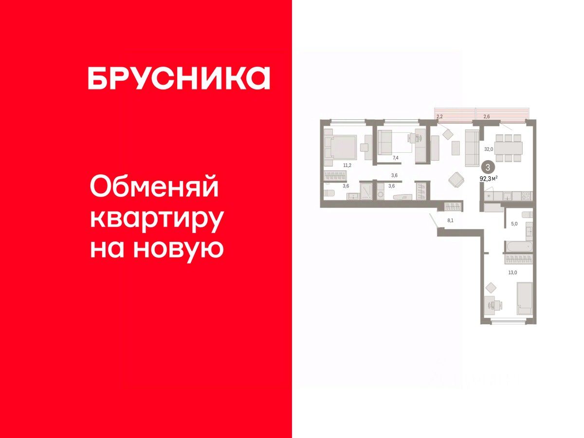 Квартира с кухней-гостиной и тремя спальнями в Бруснике в Академическом. Особенности планировки: балкон, вид во двор, второй санузел, мастер-спальня, постирочная, предчистовая отделка, разнесённые спальни. квартиры в нашей базе: АКД04-Ж8.9.2.