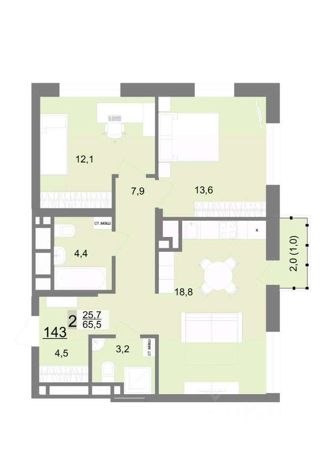 Общая площадь65,5 м2